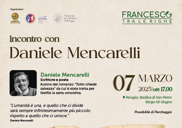 COMUNICATO STAMPA Francesco tra le righe continua con il primo ospite d’eccezione: lo scrittore Daniele Mencarelli Assisi, 27/02/2025 – Un evento imperdibile per gli amanti della letteratura, della poesia, della spiritualità francescana. Il 7 marzo, alle ore 17:00, la prestigiosa e storica Basilica di San Pietro di Perugia ospiterà Daniele Mencarelli, narratore, poeta e sceneggiatore, uno degli scrittori italiani contemporanei più apprezzati, …