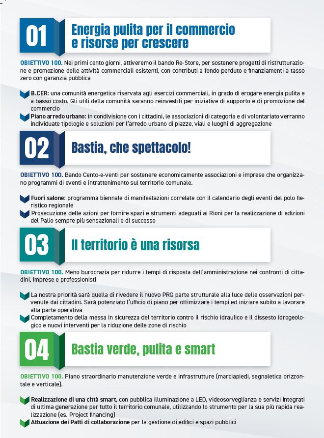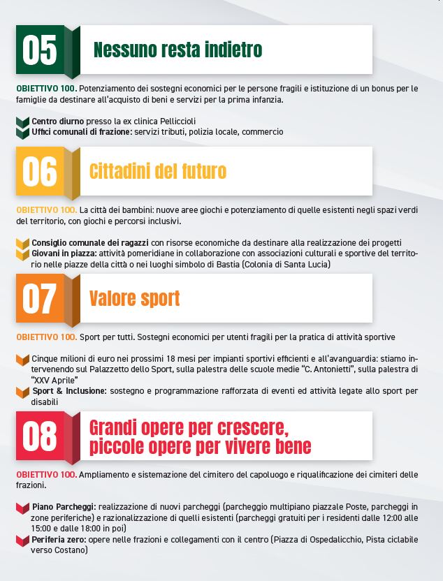 Bastia che spettacolo! Con il bando 100-e-venti per il sostegno economico di associazioni e imprese nell’organizzazioni di eventi. Perché la cultura non è uno slogan , perché sono fatti e non parole la riqualificazione dell’ex Mattatoio in piazza del Mercato come spazio espositivo e auditorium all’aperto per grandi eventi ma anche la realizzazione del Parco della musica di Costano e la riqualificazione del cinema teatro Esperia. Valori come lo sport con attività inclusive, stiamo già intervenendo sul palazzetto dello sport, sulla palestra delle scuole medie C. Antonietti, sulla palestra di XXV Aprile. Cinque milioni di euro nei prossimi diciotto mesi per impianti sportivi efficienti e all’avanguardia. Bastia città smart, verde, sicura e pulita ma anche la città dei bambini con nuove aree giochi, potenziando quelli esistenti e i percorsi inclusivi, senza dimenticare le azioni per fornire spazi e strumenti adeguati ai rioni parte integrante della vita della nostra comunità.