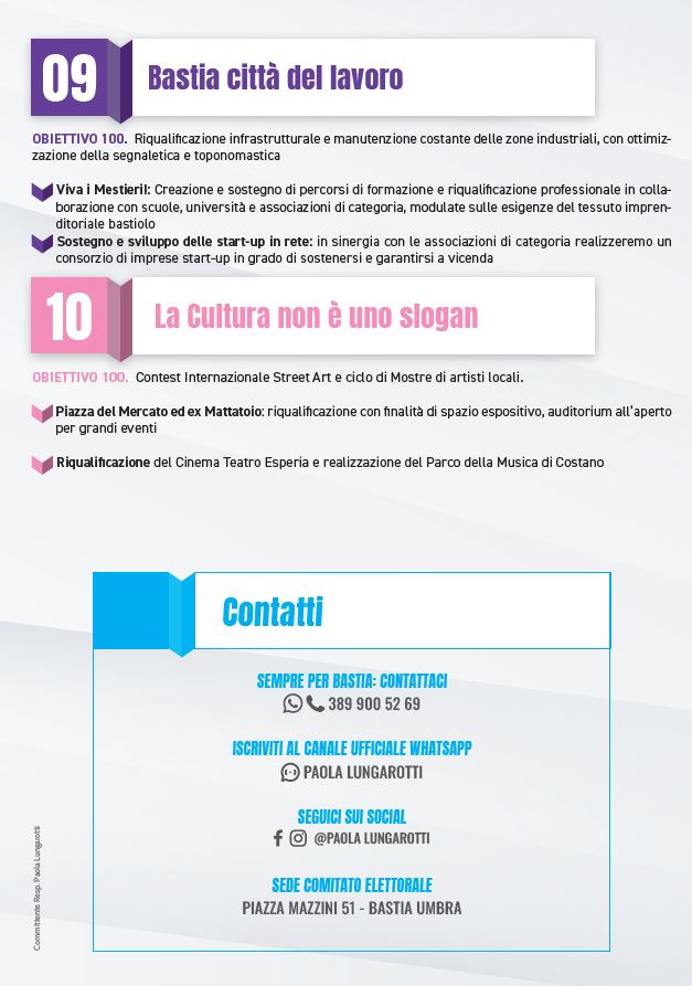 Dalle grandi opere per crescere alle piccole opere per vivere bene, dalla realizzazione dei parcheggi sul territorio come il parcheggio multipiano nel piazzale delle Poste alle attività per i giovani da realizzare presso la Colonia di Santa Lucia che diverrà un luogo a loro dedicato, al centro diurno per gli anziani nell’ex clinica Pelliccioli. Nessuno resta indietro, la persona al centro nel programma del candidato sindaco Paola Lungarotti, con sostegni economici per le persone più fragili, per l’infanzia e per gli anziani con l’impegno di valorizzare l’esistente con meno burocrazia, rivedendo il nuovo PRG parte strutturale attraverso le osservazioni dei cittadini, potenziando inoltre l’ufficio di piano. Bastia è la città del lavoro, l’obiettivo è quello di riqualificare infrastrutture facendo una manutenzione costante anche delle zone industriali, ottimizzando segnaletica e toponomastica ma anche energia pulita e risorse per il commercio con una comunità energetica riservata agli esercizi commerciali, con l’attivazione del bando Re-store. In condivisione con i cittadini, con le associazioni di volontariato e categoria, verranno individuate tipologie e soluzioni per l’arredo urbano.