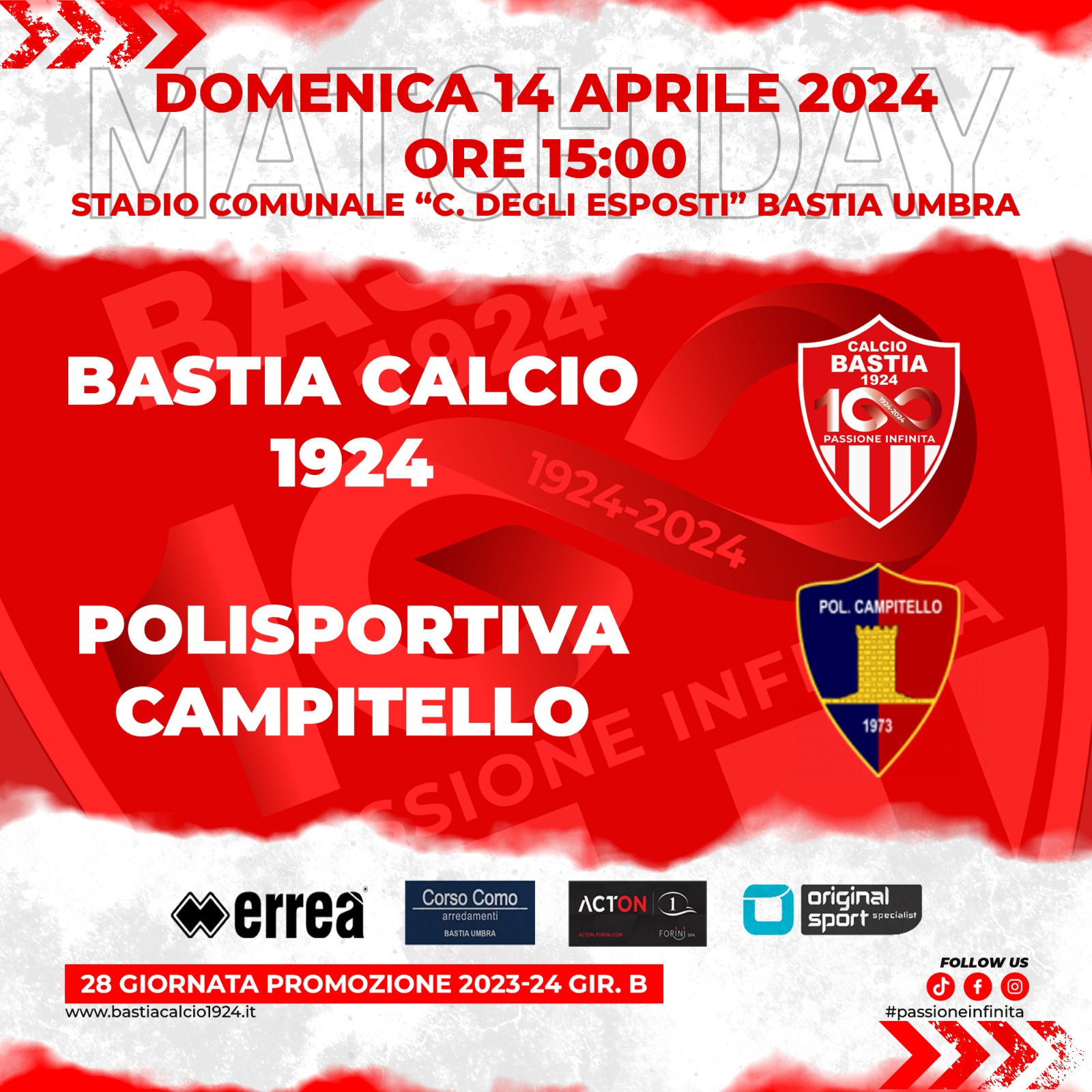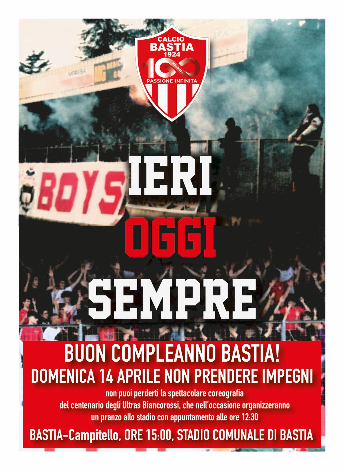 BASTIA UMBRA- Città in fermento per la partita di domenica 14 al Carlo Degli Esposti. Il Bastia Calcio 1924, secondo in classifica (60 pt) a tre giornate dal termine del campionato, ospiterà la capolista Campitello (pt 65).