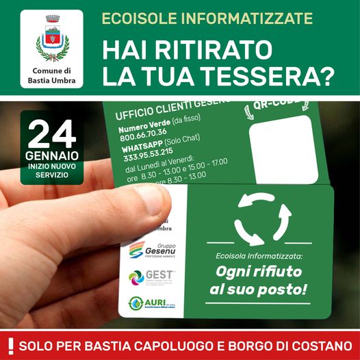 Al via lunedì 24 Gennaio 2022 il nuovo servizio di Ecoisole Informatizzate a Bastia Umbra e nel borgo di Costano, attuato dal gestore del servizio GEST/Gesenu in collaborazione con il Comune di Bastia Umbra e riguardante esclusivamente le zone attualmente servite dal sistema dei mastelli “porta a porta”, utenze domestiche.