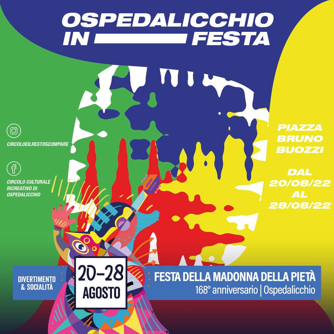 FESTA DELLA MADONNA DELLA PIETÀ, 168°  Anniversario, 1854 – 2022 . Ospedalicchio Giovani, Circolo Culturale Ricreativo di Ospedalicchio, Parrocchia di Ospedalicchio. Un intenso programma di manifestazioni per festeggiare la  Madonna della Pietà alla quale il paese è devoto per averlo preservato dai devastanti terremoti del 1832 e 1854. Divertimento e socialità, specialità culinarie e spettacoli.