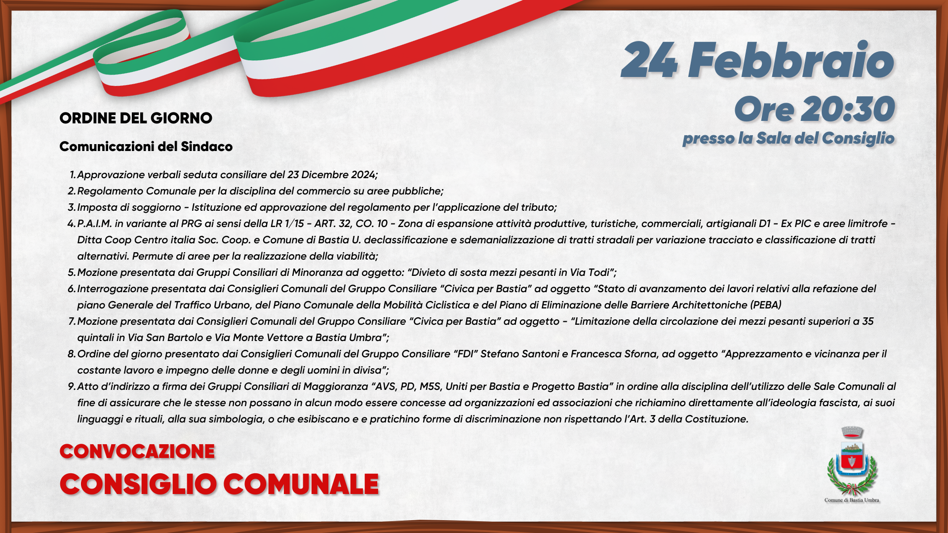 COMUNICATO STAMPA “CONVOCAZIONE CONSIGLIO COMUNALE 24 FEBBRAIO 2024”   Bastia Umb