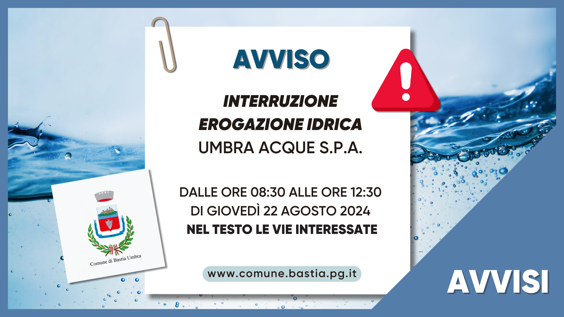 Umbra Acque S.p.A., informa l’utenza interessata che, causa lavori urgenti di manutenzione straordinaria sulla rete idrica di distribuzione dalle ore 8:30 alle 12:30 di Giovedì 22 Agosto 2024, verrà sospesa l’erogazione idrica nelle seguenti Vie e limitrofe del Comune di Bastia Umbra: