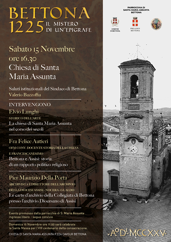 L’iniziativa mira ad approfondire la storia della Collegiata di Bettona e il contesto storico-religioso legato a un’epigrafe che attesta al 1225 una solenne cerimonia di “riconsacrazione” della chiesa parrocchiale. Recentemente restaurata, l’epigrafe è situata nella sacrestia, che potrà essere visitata al termine del convegno. Nell’ottavo centenario della riconsacrazione, che coincide anche con l’ottavo centenario del Cantico di frate Sole, l’incontro del 15 novembre vedrà la partecipazione di tre autorevoli relatori, che – dopo i saluti del sindaco bettonese, Valerio Bazzoffia, presenteranno contributi specialistici: a parlare saranno il professore e storico dell’arte Elvio Lunghi, che affronterà il tema “La chiesa di Santa Maria Assunta nel corso dei secoli”, fra Felice Autieri, docente di storia della Chiesa e francescanesimo, che interverrà sul rapporto tra le due città (“Bettona e Assisi: storia di un rapporto politico religioso”) e Pier Maurizio Della Porta, archivista e direttore dell’Archivio della diocesi Assisi-Nocera-Gualdo, che presenterà un approfondimento documentario su “Le carte d’archivio della Collegiata di Bettona presso l’archivio Diocesano di Assisi”. L’ingresso è libero e l’evento sarà seguito da un momento conviviale aperto a tutti. Domenica 16 novembre, alle ore 11.00, sarà poi celebrata una messa solenne proprio nella chiesa di Santa Maria Assunta.