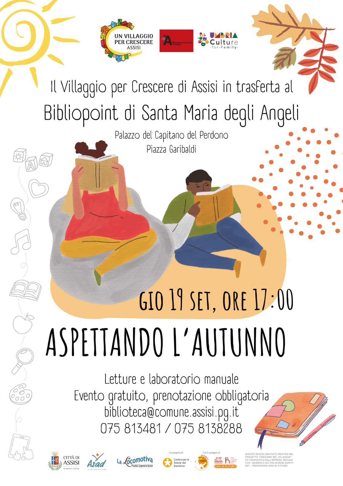 La Biblioteca Comunale di Assisi in collaborazione con Un Villaggio per Crescere di Assisi invita tutte e tutti al Bibliopoint di Santa Maria degli Angeli per l’incontro con i libri e il laboratorio tematico “Aspettando l’autunno”.