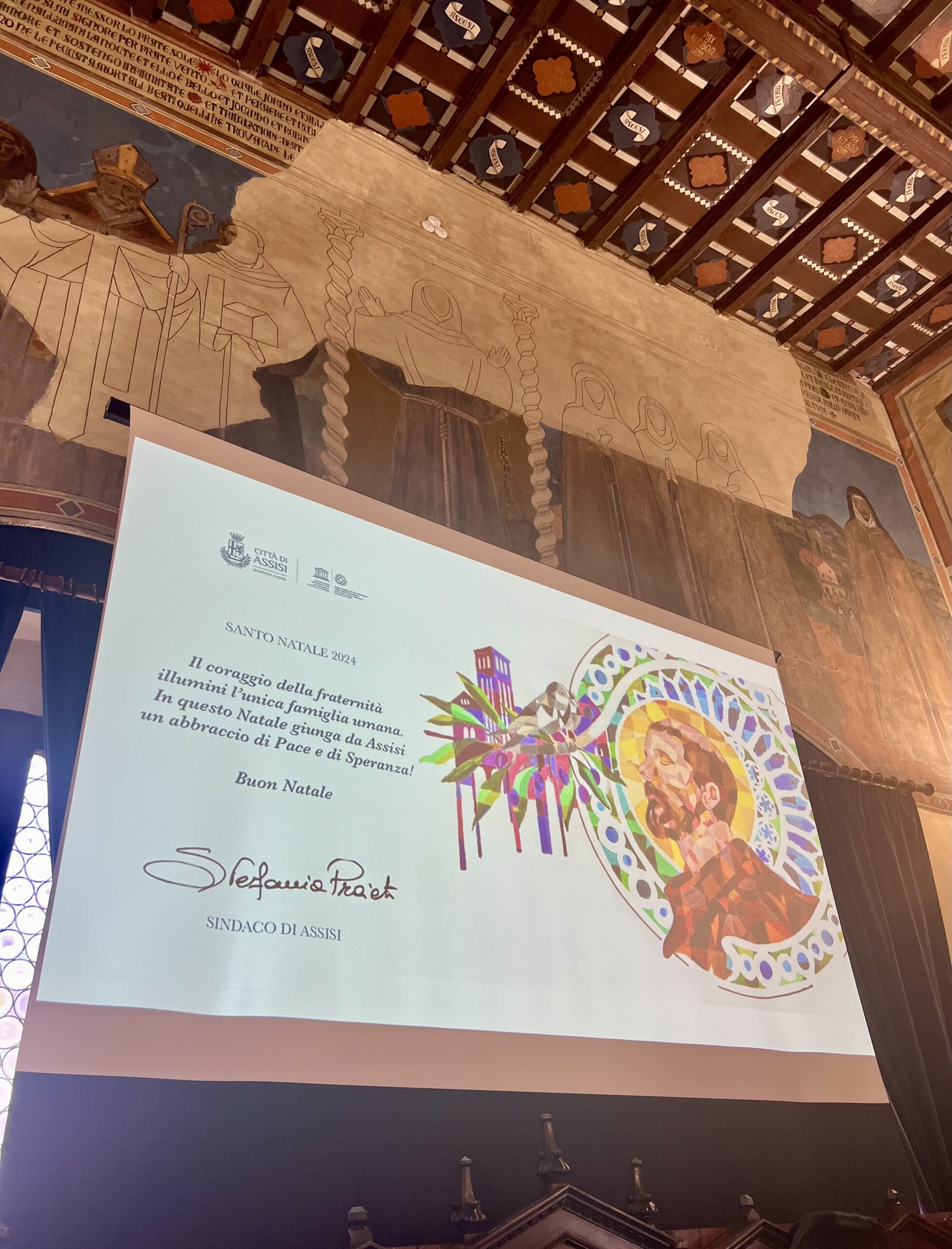 La classe vincitrice ha presentato un elaborato artistico che vede in primo piano la figura di San Francesco, incastonata nel rosone colorato della basilica di Assisi, con un ramo d’ulivo e una colomba simboli di pace. Tale interpretazione del Cantico delle Creature – scritto dal Poverello di Assisi nel 1225 e che nel 2025 compie 800 anni – è stata riprodotta nel biglietto di auguri, con la frase: “Il coraggio della fraternità illumini l’unica famiglia umana. In questo Natale giunga da Assisi un abbraccio di Speranza e di Pace. Buon Natale”.