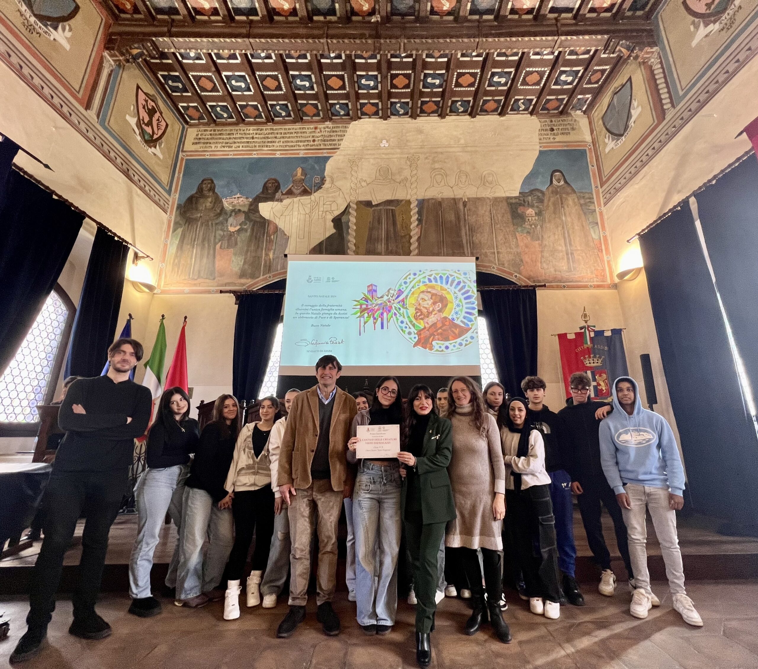 È andato alla classe 3ª/A del Liceo economico “Sesto Properzio” il primo premio del concorso di idee, indetto dal Comune di Assisi e rivolto alle scuole della città, per l’esecuzione di un progetto grafico dedicato al Cantico delle Creature e finalizzato alla realizzazione del biglietto istituzionale con gli auguri di Natale, che sarà inviato ai governanti di tutti gli Stati del mondo, a firma del sindaco Stefania Proietti.