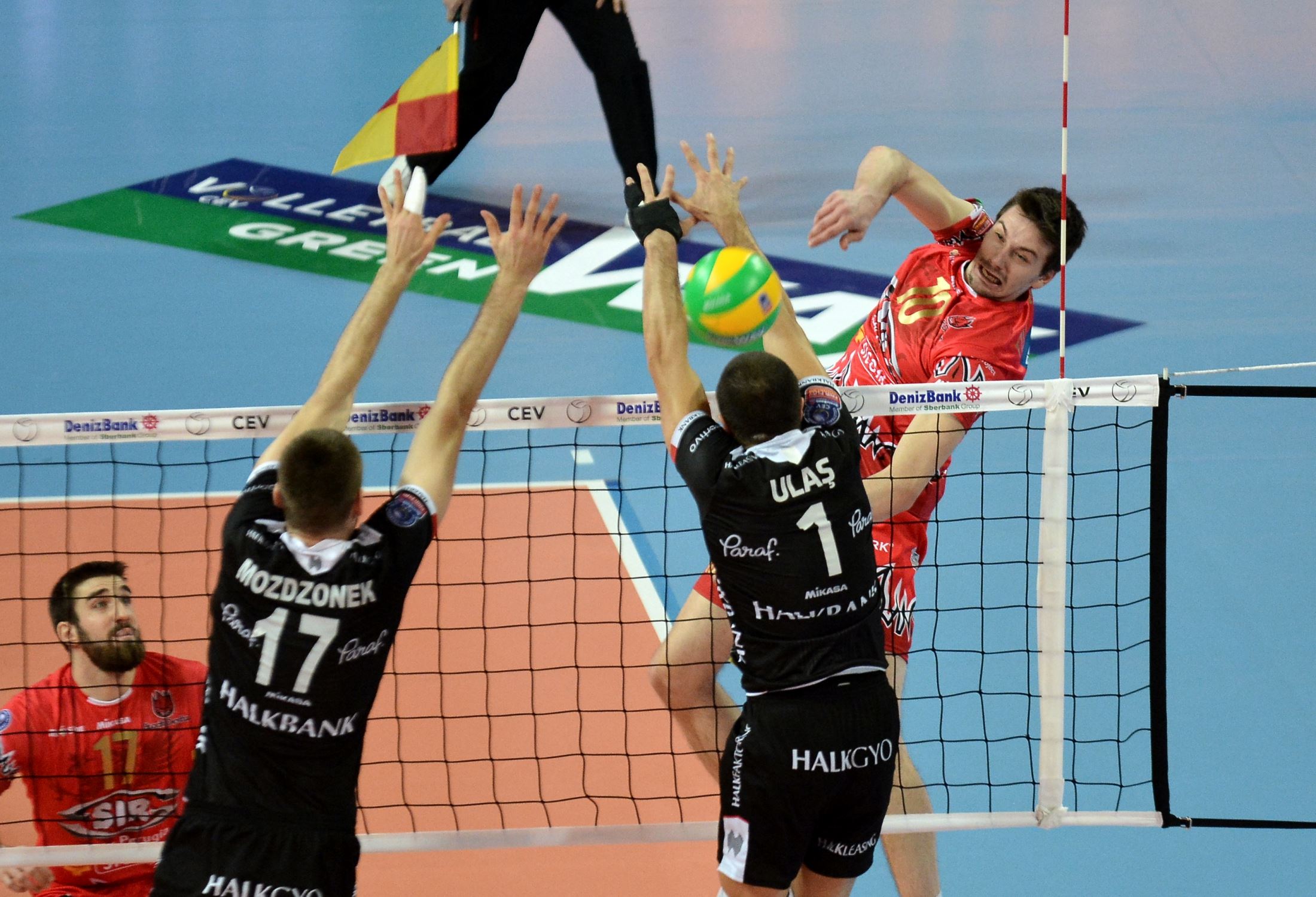 Nelle foto: Tzoiumakas in attacco (foto Cev) – esultanza dopo un punto (foto Cev) – la locandina de “I Sirmaniaci scendono in campo”