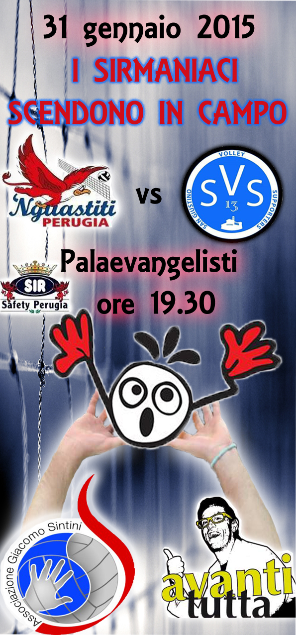 “È l’evento dell’anno. Lo stavamo aspettando tutti e finalmente è arrivato! I Sirmaniaci con l’Associazione Giacomo Sintini e Avanti Tutta Onlus di Leonardo Cenci sono orgogliosi di presentarvi “I Sirmaniaci scendono in campo”. Si svolgerà nella storica cornice perugina del Palaevangelisti sabato 31 Gennaio alle ore 19.30 l’incontro a porte aperte tra ‘Nguastiti e SVS Sangiustino Volley Supporters. Per una volta i ruoli si invertono e sono i tifosi a scendere in campo in nome della solidarietà. Tante, anzi tantissime le sorprese che attendono chi vorrà esser presente al Big Match di sabato quindi…vi aspettiamo. NON MANCATE!”.