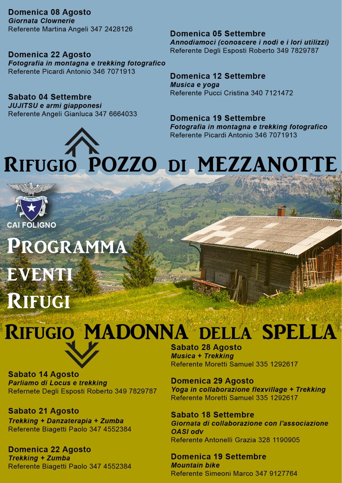 Da domenica 8 agosto al 19 settembre La Capanna ” La Spella” sita nel Parco del Monte Subasio e ” Il Pozzo di Mezzanotte” sito nel Monte Brunette accolgono tutti gli amanti della montagna, che hanno voglia di scoprire quanta bellezza c’ è nelle sommità.