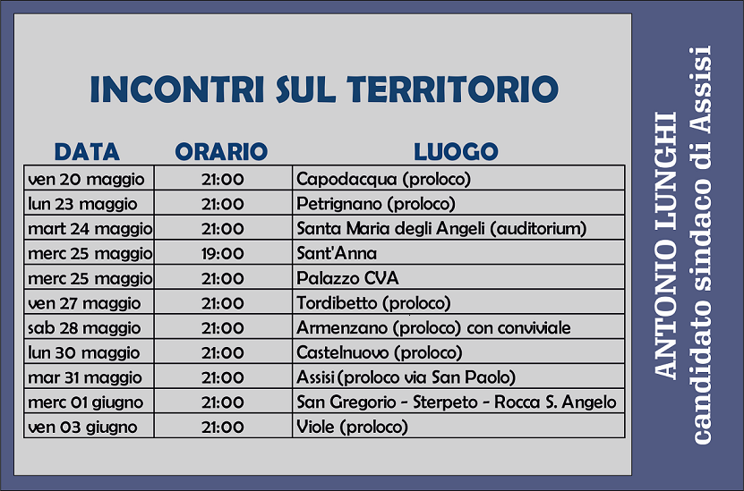 Calendario degli incontri sul territorio del candidato sindaco Antonio Lunghi.
