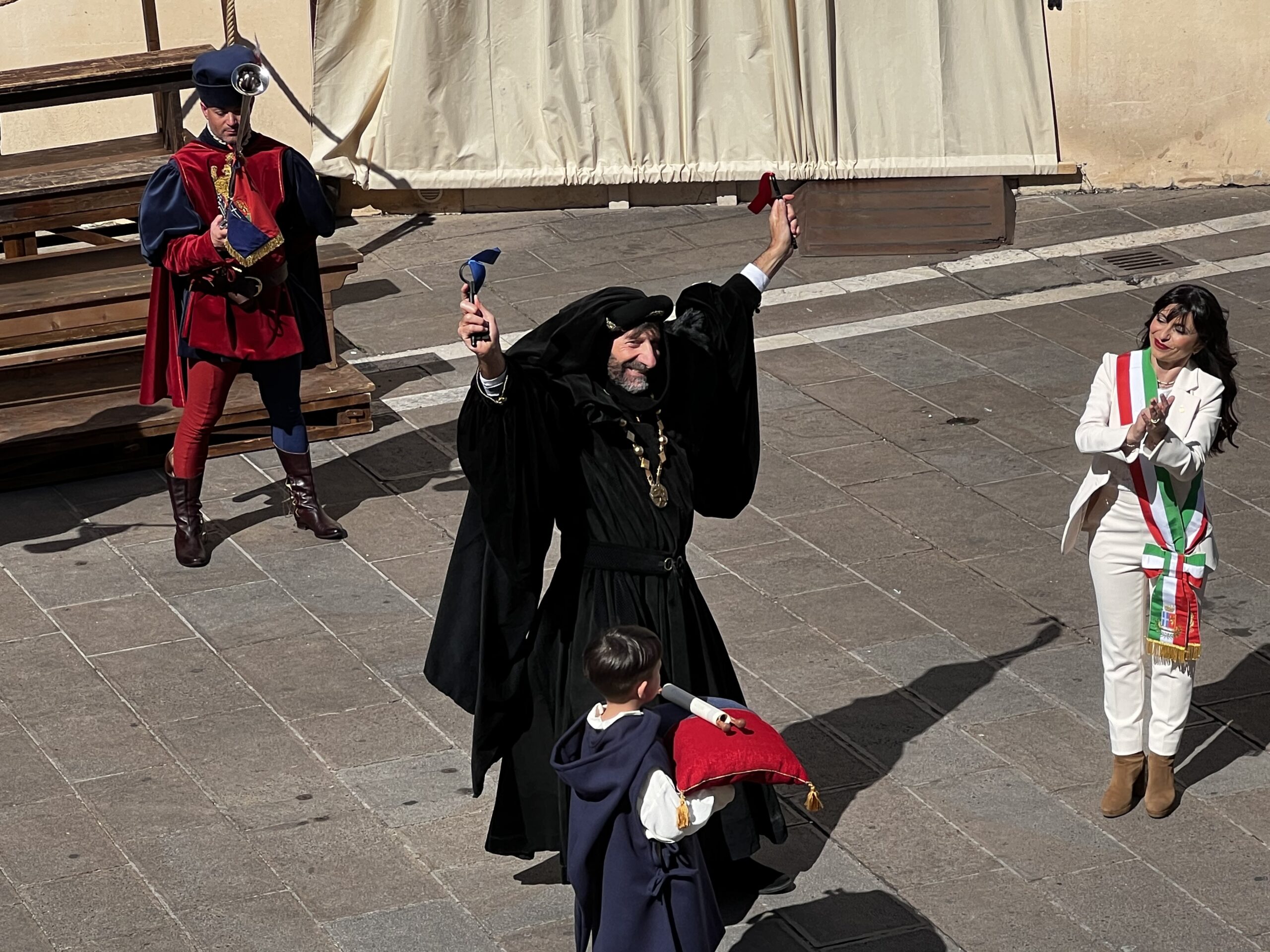 Alle ore 16, in piazza del Comune i cori delle due Parti hanno eseguito insieme il Coprifuoco, l’antico inno della città di Assisi. A seguire, il Maestro de Campo Bruno Cianetti ha ricevuto dal sindaco di Assisi Stefania Proietti le chiavi della città di fronte ad un numeroso e festante pubblico presente sugli spalti. Tanti i cittadini e i turisti che hanno invaso le tribune per assistere al primo momento di un appuntamento cardine per Assisi. Dopo i cortei istituzionali della Magnifica Parte de Sotto e della Nobilissima Parte de Sopra e la restituzione del Palio, il saluto del magistrato presidente dell’Ente Calendimaggio Marco Tarquinio e l’investitura dei tre giurati: la storica Virtus Maria Zallot, il regista Claudio Autelli e il musicologo Sandro Cappelletto.