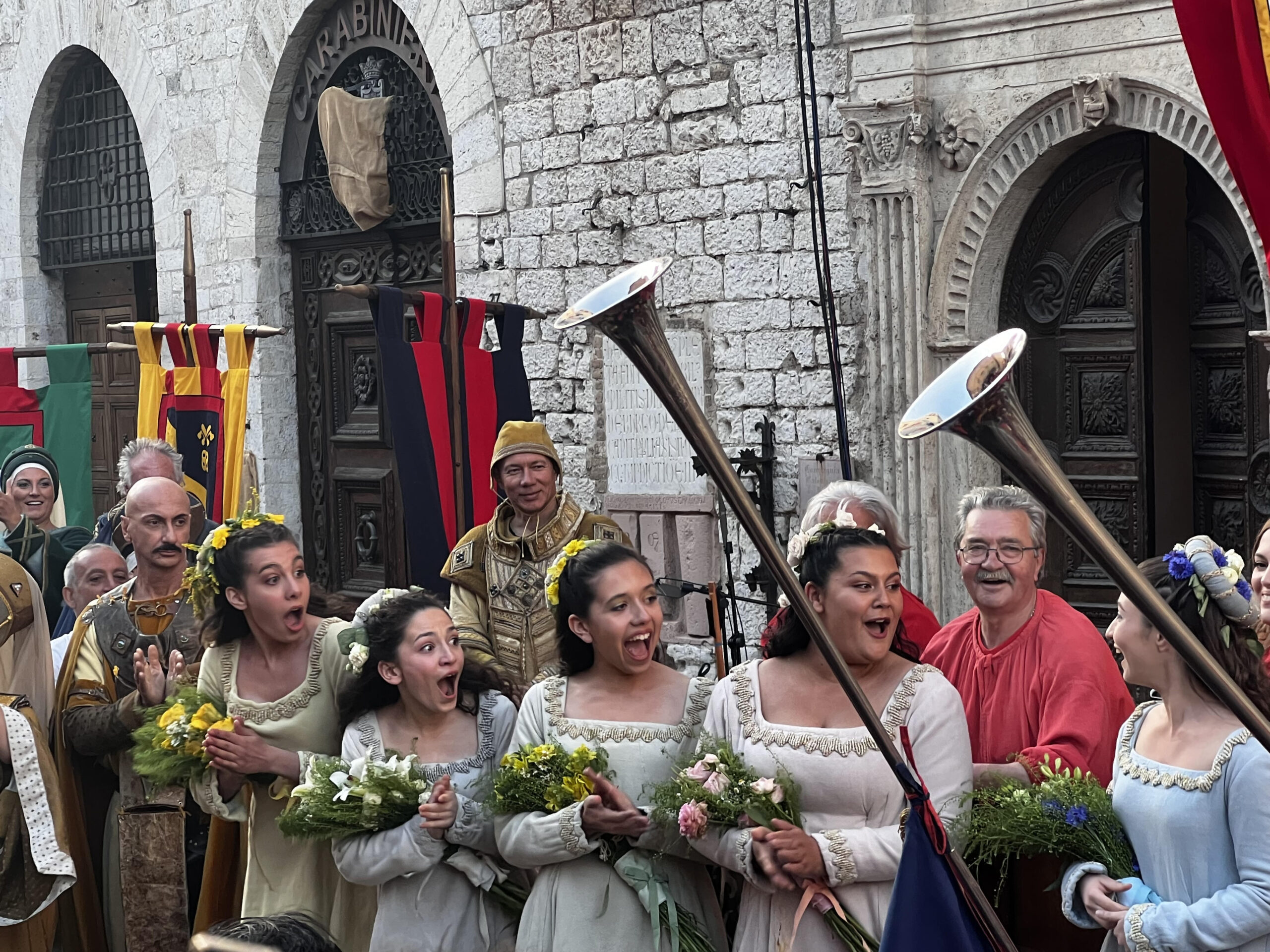 Il pomeriggio è iniziato con i cortei della Magnifica Parte de Sotto e della Nobilissima Parte de Sopra che hanno portato in Piazza del Comune uno spettacolo unico per celebrare la bella stagione e presentare al numeroso pubblico presente sugli spalti le proprie Madonne Primavera: Milena Bocchini, Chiara Fabbri, Matilde Fiorucci, Martina Santarelli e Maddalena Simonelli per la Parte de Sotto ed Elisa Benvenuto, Viola Frascarelli, Caterina Roberti, Maria Sophia Sensi e Teresa Angelica Settimi per la Parte de Sopra.