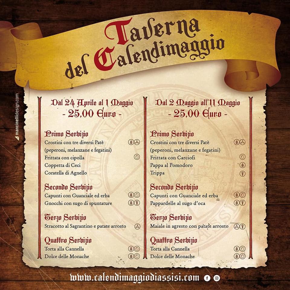 Info, menu, giorni ed orari di apertura (dal 24 aprile all’11 maggio) – consultabili anche alle rispettive pagine social: Calendimaggio di Assisi, Magnifica Parte de Sotto e Nobilissima Parte de Sopra.