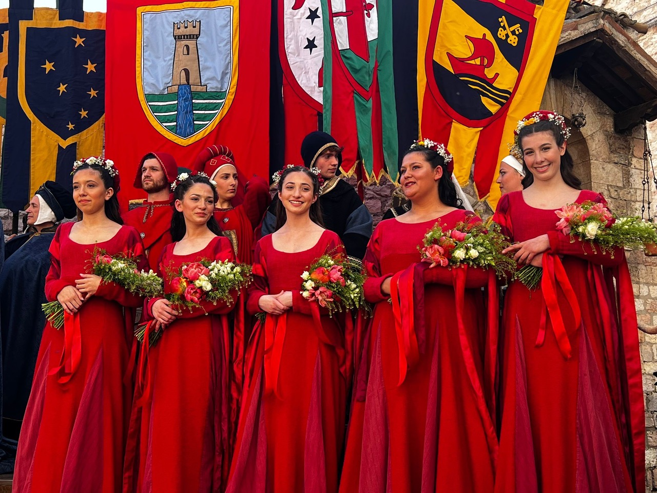 ASSISI 30 APRILE 2024 – Finalmente svelati i nomi delle Madonne Primavera – cinque per Parte – tra le quali sarà eletta la regina del Calendimaggio 2024. Martedì 30 aprile, in una piazzetta della Chiesa Nuova gremita di cittadini e turisti, la Magnifica Parte de Sotto e la Nobilissima Parte de Sopra hanno presentato le proprie Madonne Primavera. Sono Milena Bocchini, Chiara Fabbri, Matilde Fiorucci, Martina Santarelli e Maddalena Simonelli per la Parte de Sotto ed Elisa Benvenuto, Viola Frascarelli, Caterina Roberti, Maria Sophia Sensi e Teresa Angelica Settimi per la Parte de Sopra.