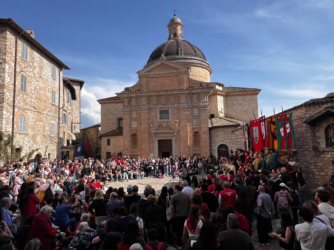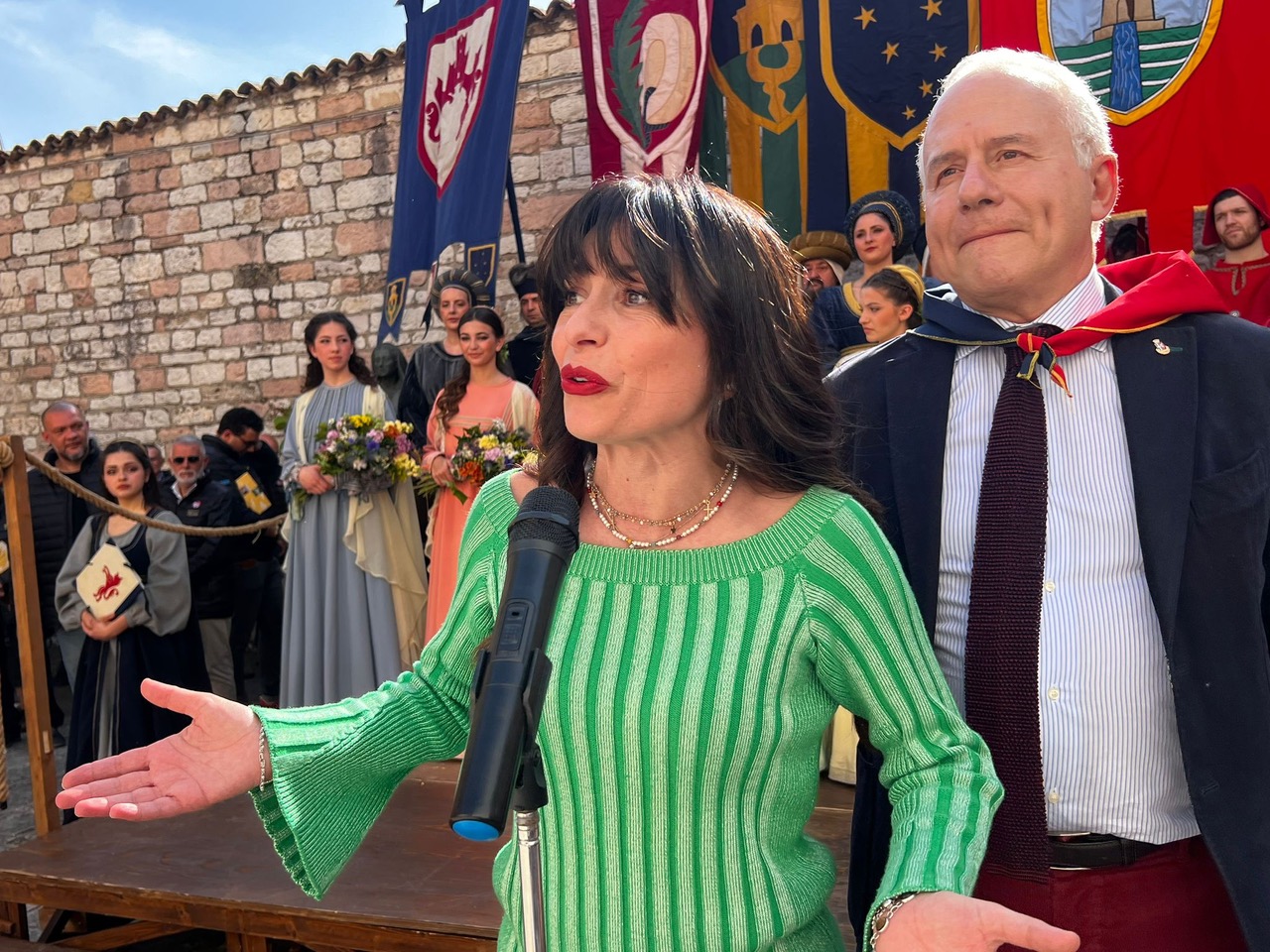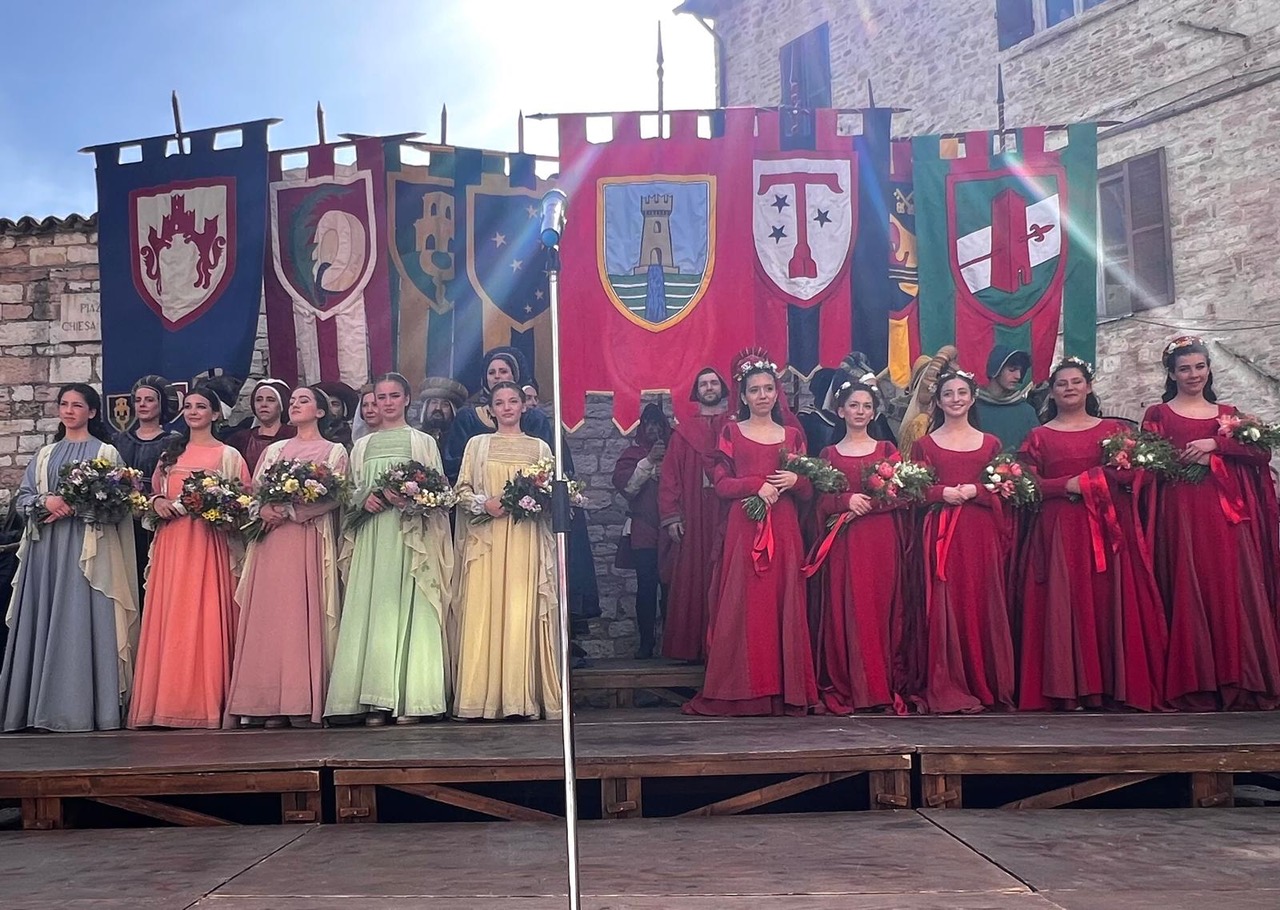 Prima dell’omaggio canoro dei Cantori di Assisi, che hanno eseguito brani della tradizione della Festa, il magistrato presidente dell’Ente Calendimaggio ha detto che “la Primavera che abbiamo annunciato è arrivata e la vedremo nel volto di queste giovani donne. È il nostro Calendimaggio e a me spetta il compito di dirvi grazie e di darvi il benvenuto dentro la festa vostra e nostra. Una città è anche, e soprattutto, le sue emozioni e la sua storia. Questa festa è gioia e fatica. Siate orgogliosi, siate forti, siate leali perché questa è la nostra festa. Viva il Calendimaggio, viva Assisi che è cuore della nostra terra d’Umbria e batte in modo speciale”.
