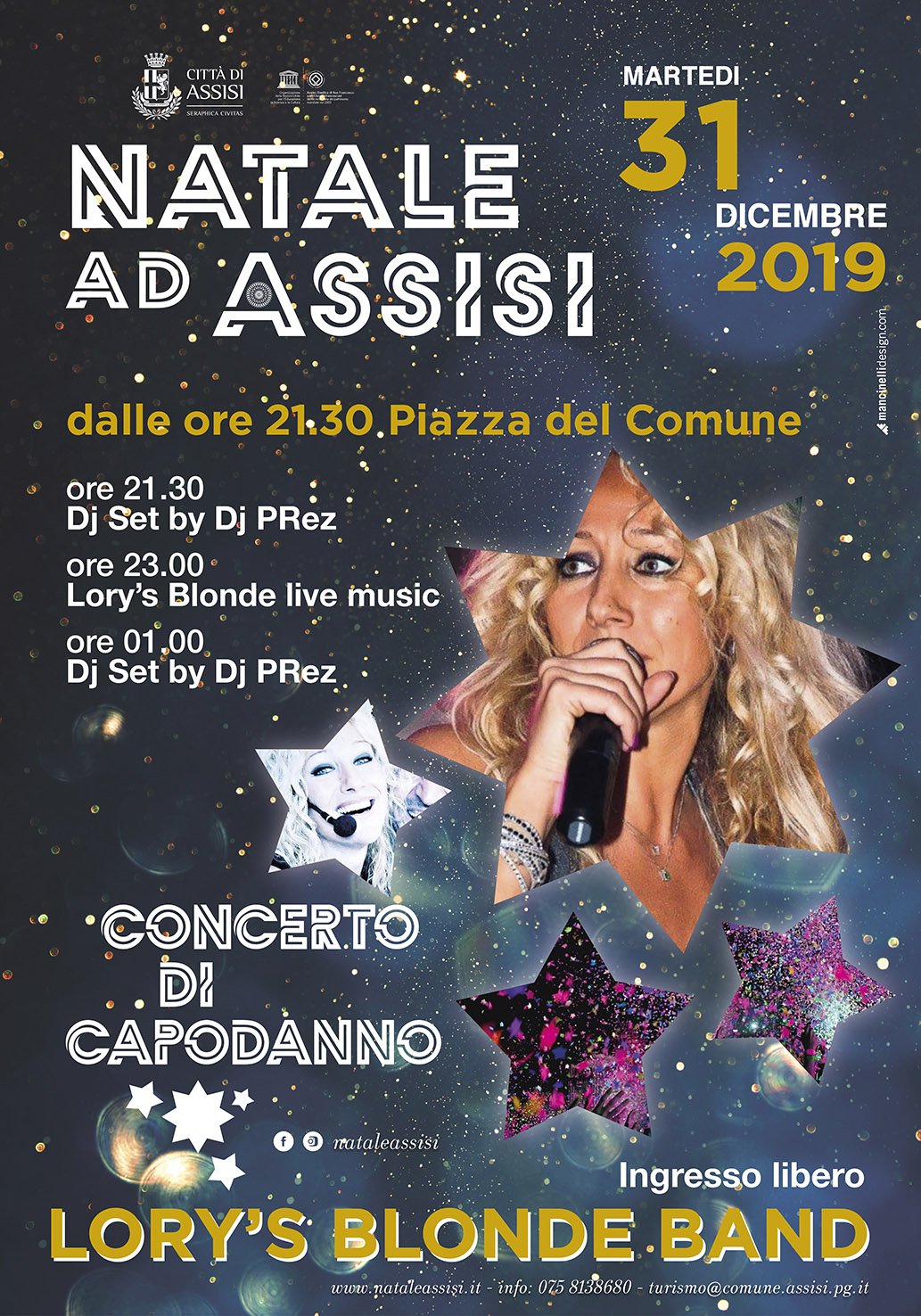 Assisi, 28 novembre 2019 – Musica funky e pop dance anni 70/80/90 con la Lory’s Blonde Band e Dj set con dj Prez. Questi gli ingredienti principali del Capodanno di Assisi che in Piazza del Comune proporrà tanto divertimento con musica trascinante tutta da ballare per una serata all’insegna dell’allegria. Uno spettacolo coinvolgente in un’atmosfera unica, proprio accanto al luminoso Bosco incantato ispirato al Terzo Paradiso del noto artista Michelangelo Pistoletto, che riconfigura il simbolo dell’infinito nel segno della responsabilità e rende ancora più suggestiva la piazza principale della città.