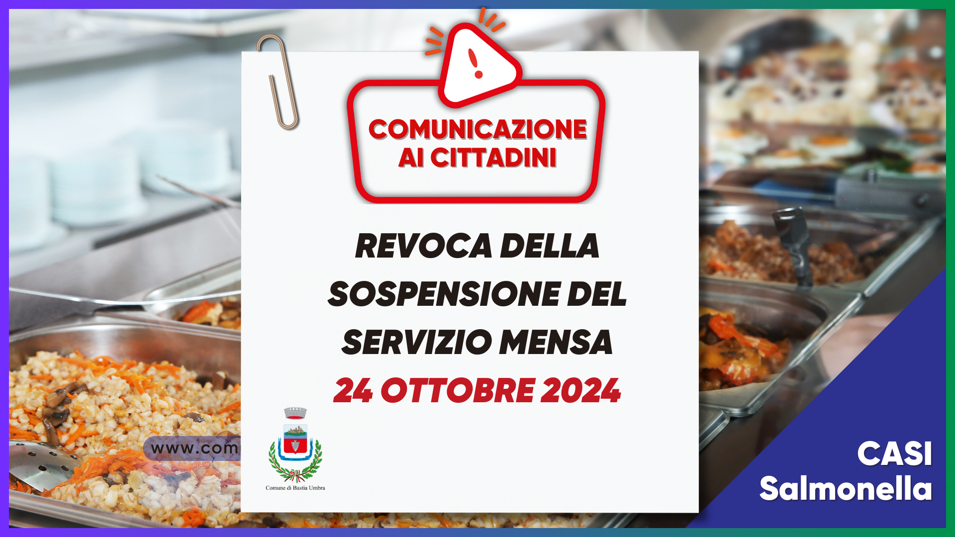 Si comunica ai cittadini che, in relazione alla sospensione dell’attività di ristorazione collettiva: mensa scolastica e terminali di distribuzione del 10/10/2024 e dell’11/10/2024 relativa al centro cottura Pascoli e i terminali di distribuzione (Scuola Infanzia Pascoli, Scuola Infanzia e Primaria XXV Aprile, Scuola Infanzia e Primaria Costano, Scuola Infanzia e Primaria Borgo Primo Maggio, Scuola Primaria Don Bosco, Asilo Nido San Lorenzo) l’USL Umbria 1 dispone oggi la revoca del provvedimento di sospensione.
