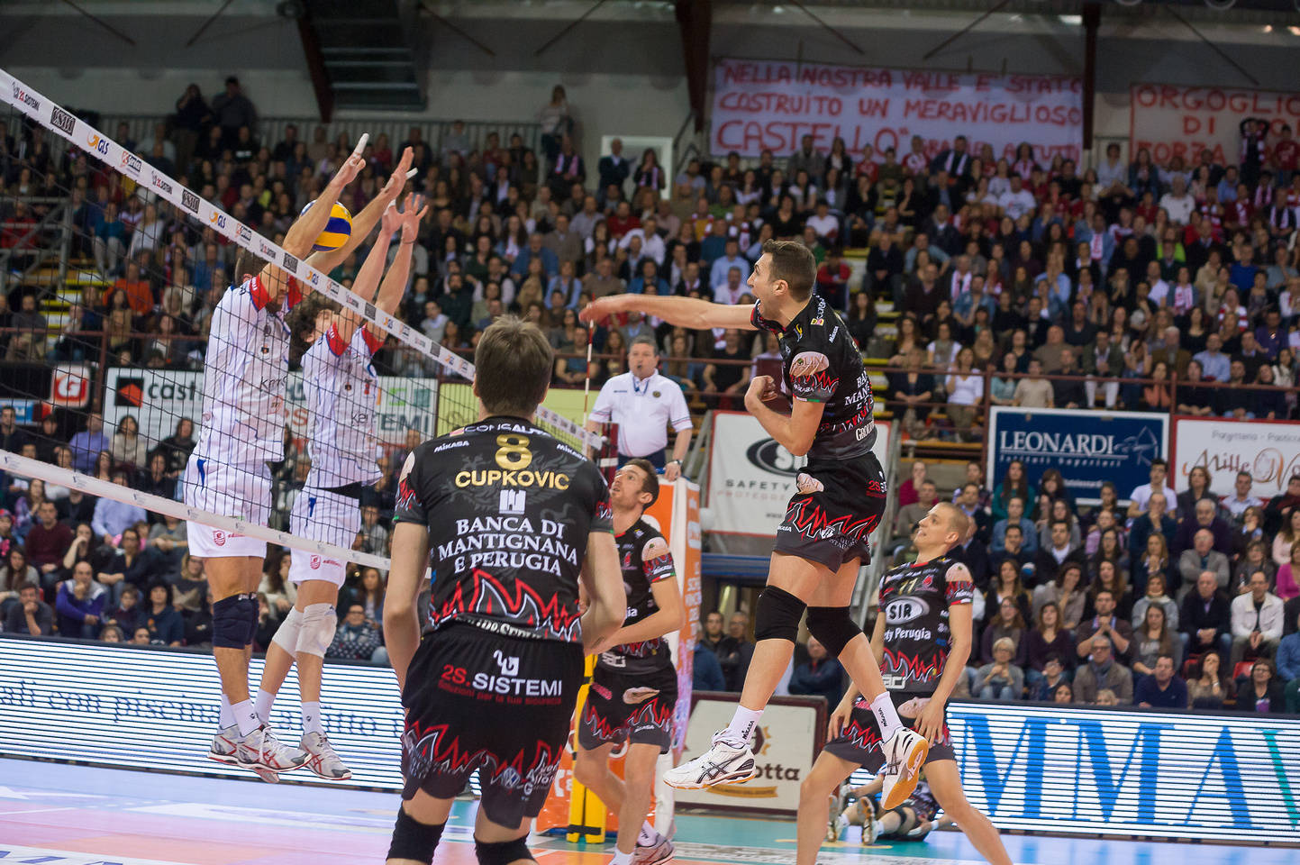 Lo è stato davvero stasera a Pian di Massiano con oltre quattromila presenti sulle gradinate e con le due tifoserie organizzate che hanno fatto show nello show. Kovac ha lasciato a riposo capitan Vujevic (nemmeno a referto) in vista della post season, per il resto formazione tipo con Atanasijevic recuperato in extremis dopo una settimana condita da virus influenzale. Match a due facce il derby di ritorno. Castello è scappata sul doppio vantaggio (molto contestato dalla Sir il finale di secondo set), Perugia ha saputo reagire al meglio nel terzo e quarto parziale. Il tie break è stato per cuori forti con Perugia che è scappata via (10-6), con Castello che è rientrata grazie al servizio (13-13) e che ha chiuso con il punto di Van Walle. Per Kovac, al di là del risultato finale, buoni riscontri in vista dei playoff. Atanasijevic, nonostante i pochi allenamenti sulle gambe ne ha messi 28, vincendo la classifica del miglior realizzatore del campionato. Ottimo anche Petric, 25 palloni vincenti, e ottimo l’ingresso dal terzo set di Mitic in regia (per il palleggiatore serbo anche 5 punti). I bianconeri hanno otten