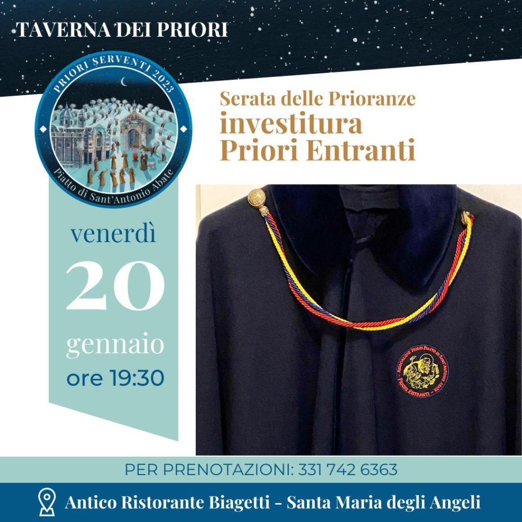 Venerdì 20 gennaio presso la Taverna dei Priori, Antico Ristorante Biagetti, I Priori Serventi 2023 presenteranno la famosa “Cacciata dei Priori”. Come da tradizione i Priori Serventi chiameranno al loro fianco i Priori Entranti per l’edizione 2024. Sarà una sorpresa scoprire i nuovi 12. La presentazione dei Priori Entranti avviene nell’ambito della Festa del Piatto di Sant’Antonio Abate che si …
