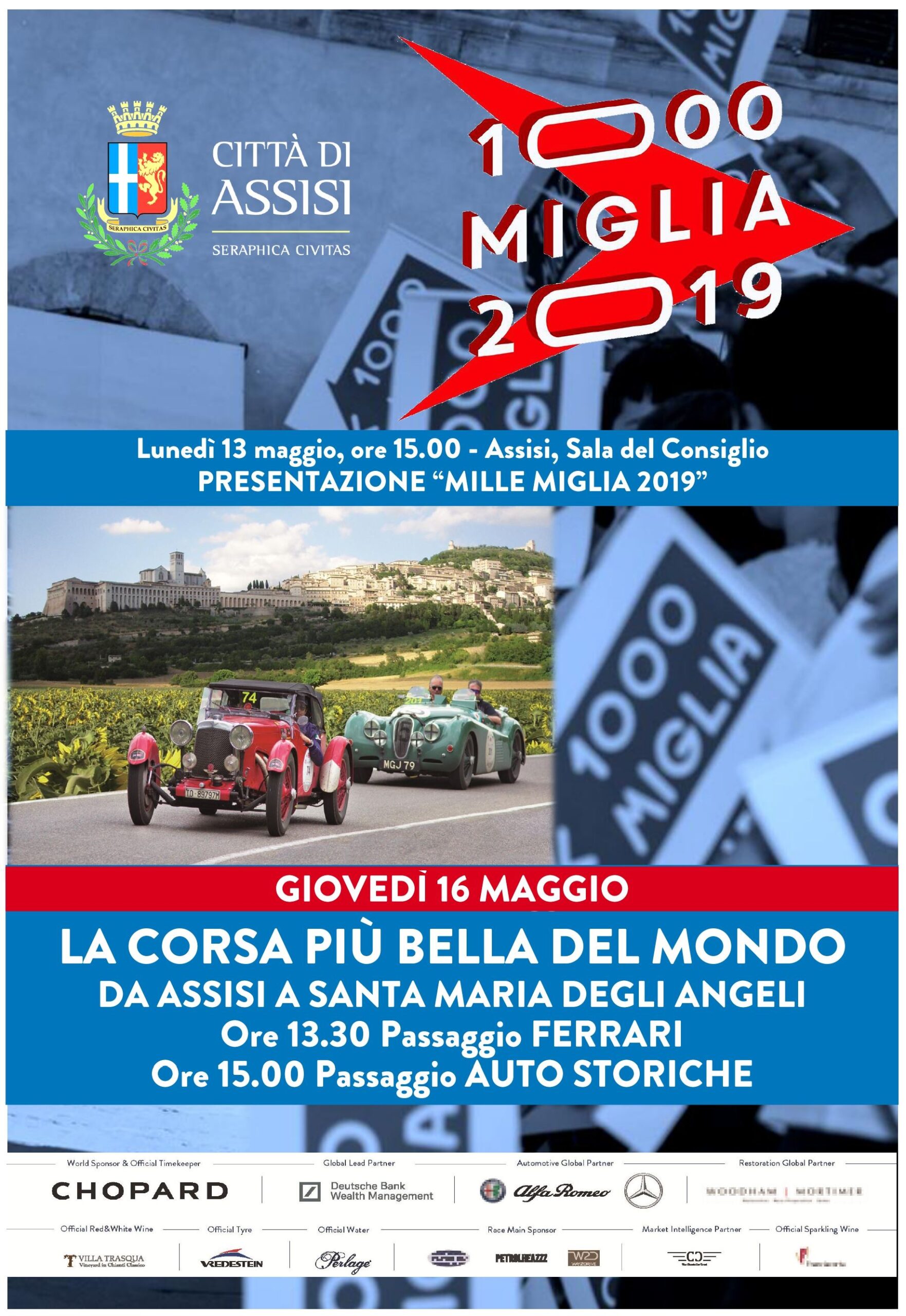 Lunedì 13 maggio, alle ore 15, presso la Sala del Consiglio Comunale, si svolgerà una conferenza stampa sulla Mille Miglia 2019, la corsa più bella del mondo, che giovedì 16 passerà per le strade di Assisi e Santa Maria degli Angeli. Saranno presenti il sindaco Stefania Proietti e l’assessore allo sport Veronica Cavallucci. 11/05/2019 Comune di Assisi