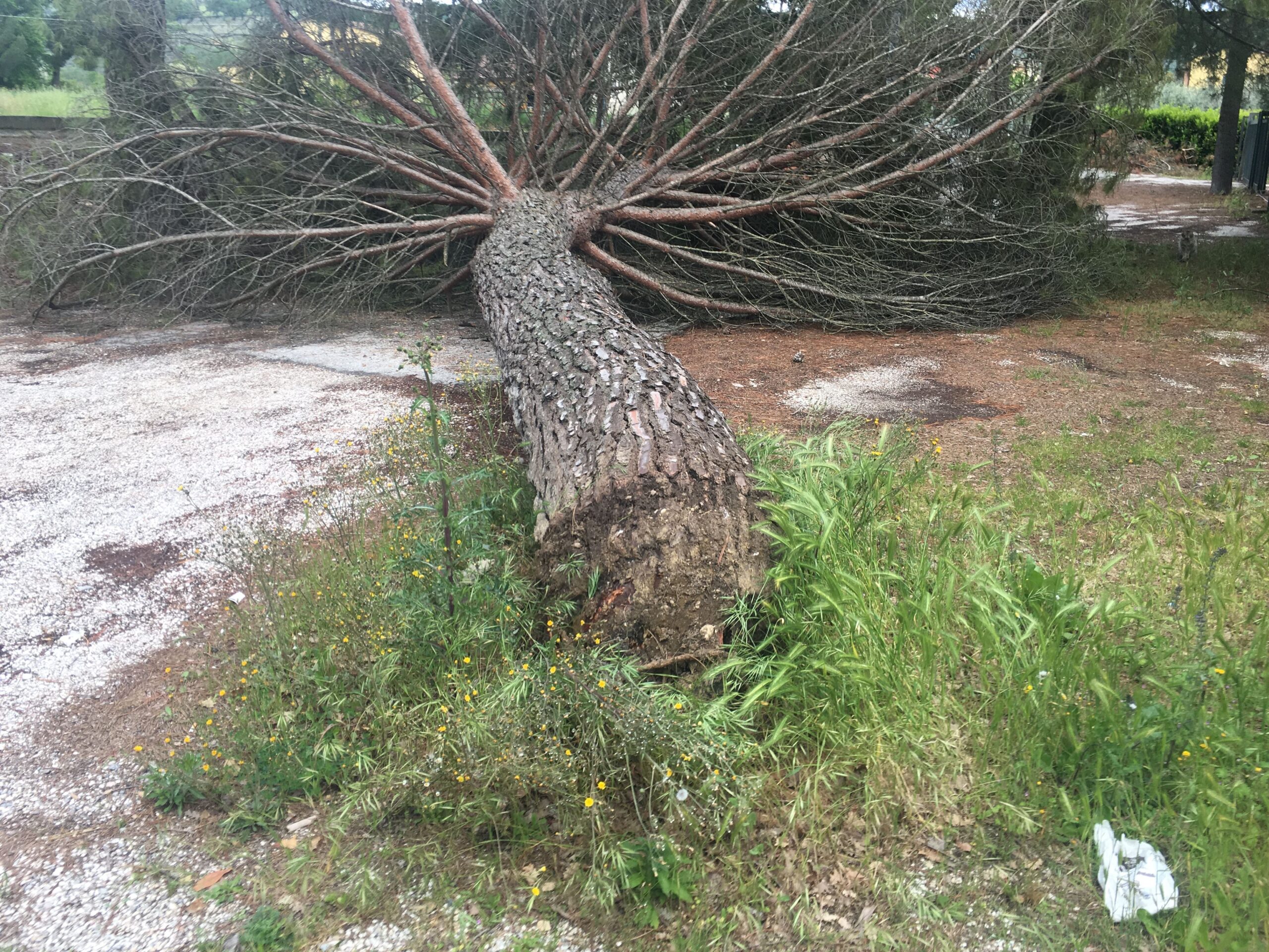 Centro ricreativo Eliseo Biagetti di Palazzo – Assisi, cade un grosso pino marittimo, zona abbandonata e piena di rifiuti.