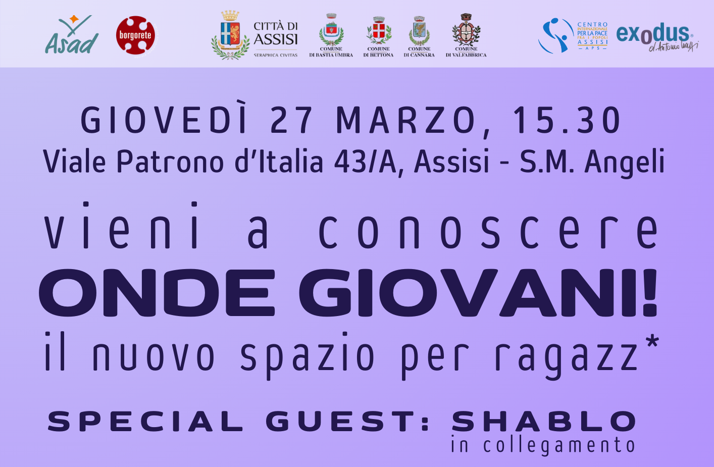 COMUNICATO STAMPA Si trova a Santa Maria degli Angeli, a servizio dei Comuni della Zona Sociale 3 ONDE GIOVANI, IL 27 MARZO INAUGURAZIONE DEL NUOVO SPAZIO DI AGGREGAZIONE PER RAGAZZI DEL TERRITORIO Special guest Shablo: il famoso dj e produttore discografico sarà in collegamento Assisi, 25/03/2025 – Si terrà il 27 marzo 2025, alle ore 15.30, l’inaugurazione di “Onde …