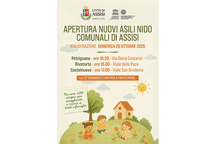 COMUNICATO STAMPA Saranno attivi dal 3 novembre e potranno accogliere fino a 135 bimbi TRE NUOVI ASILI NIDO COMUNALI AD ASSISI, INAUGURAZIONE IL 26 OTTOBRE 2025 Si trovano a Castelnuovo, Petrignano e Rivotorto e sono stati realizzati con fondi PNRR e risorse comunali Assisi, 23/10/2025 – Saranno inaugurati il 26 ottobre e attivi dal 3 novembre 2025 i tre …