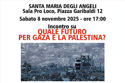 COMUNICATO STAMPA Assisi, 03/11/2025 GAZA e la PALESTINA Il circolo culturale “primomaggio” organizza: SANTA MARIA DEGLI ANGELI – Sala Pro Loco, Piazza Garibaldi 12 Sabato 8 novembre 2025 – ore 17,00 Incontro su: Quale futuro per GAZA e la PALESTINA? Ne parleranno: CHIARA CRUCIATI – vice direttrice de il manifesto, autrice dei libri “Israele mito e realtà” e “50 …