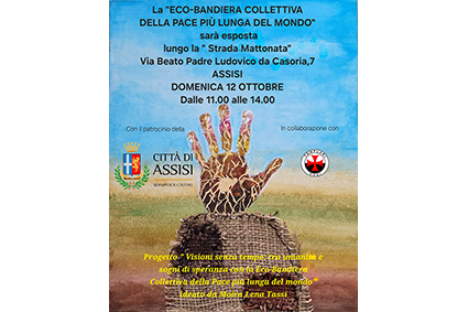 COMUNICATO STAMPA È stata realizzata da oltre mille bambini e persone fragili in un progetto promosso dall’artista Moira Lena Tassi AD ASSISI UNA ECO-BANDIERA COLLETTIVA DELLA PACE LUNGA 130 METRI L’opera sarà srotolata il 12 ottobre lungo il percorso della Marcia Assisi, 09/10/2025 – Una eco-bandiera collettiva della pace lunga 130 metri, realizzata da oltre mille cittadini fra bambini …