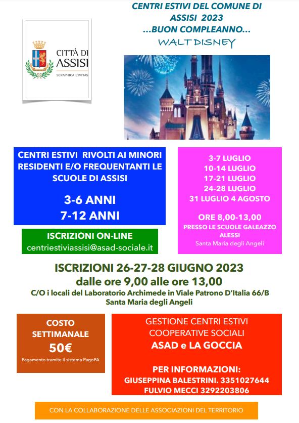 Dal 3 luglio al 4 agosto si svolgeranno i Centri estivi 2023, voluti dall’amministrazione comunale, presso i locali della scuola “G. Alessi”, in via Toti, a Santa Maria degli Angeli. È rivolto a bambini e ragazzi fra 3 e 6 anni e fra 7 e 12 anni, organizzati in vari gruppi. Sarà attivo dal lunedì al venerdì, dalle ore …