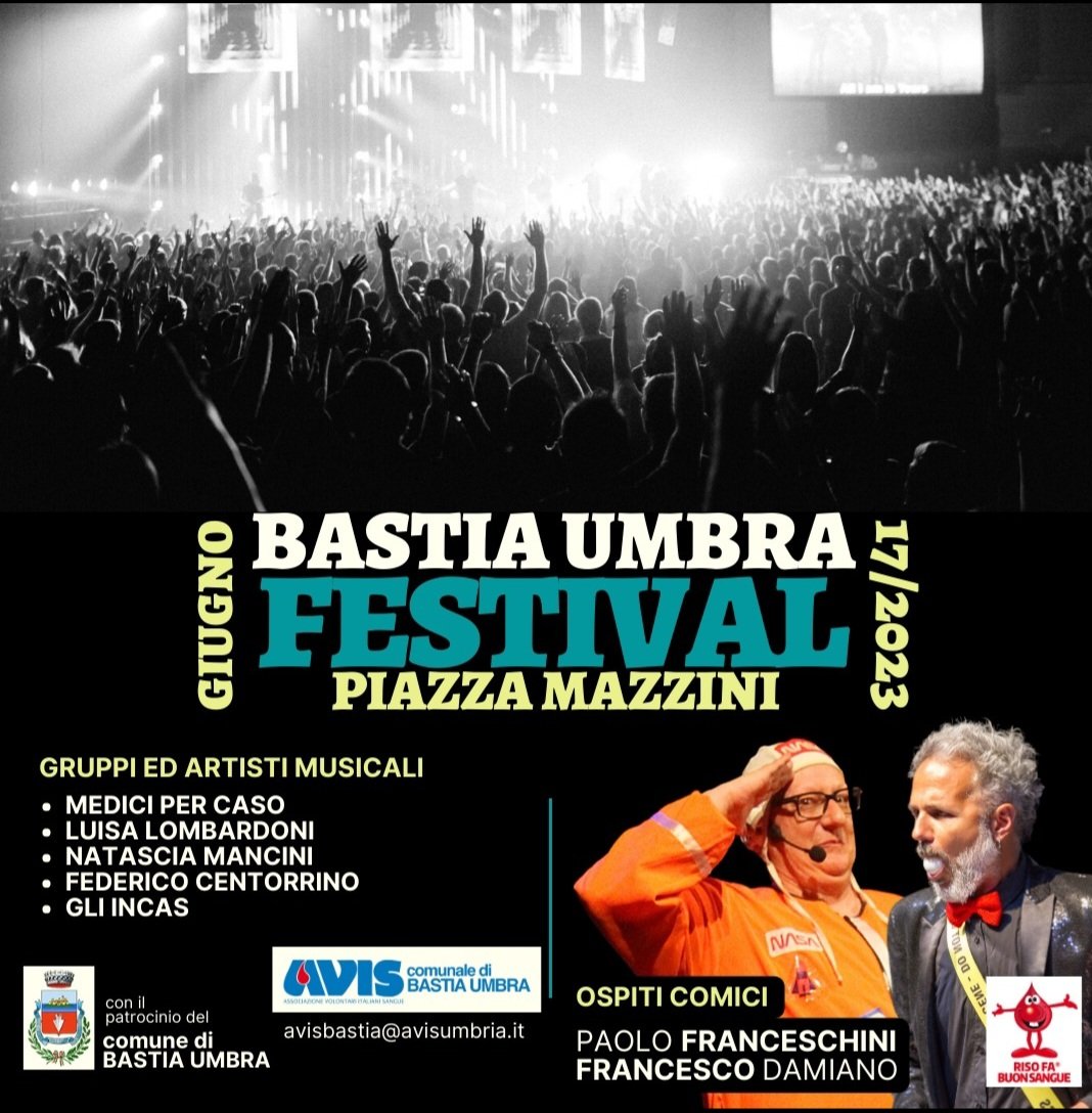 Nell’ambito delle iniziative del 50° anniversario di AVIS Comunale di Bastia Umbra il 17 giugno in Piazza Mazzini cabaret e musica dalle 19.00.