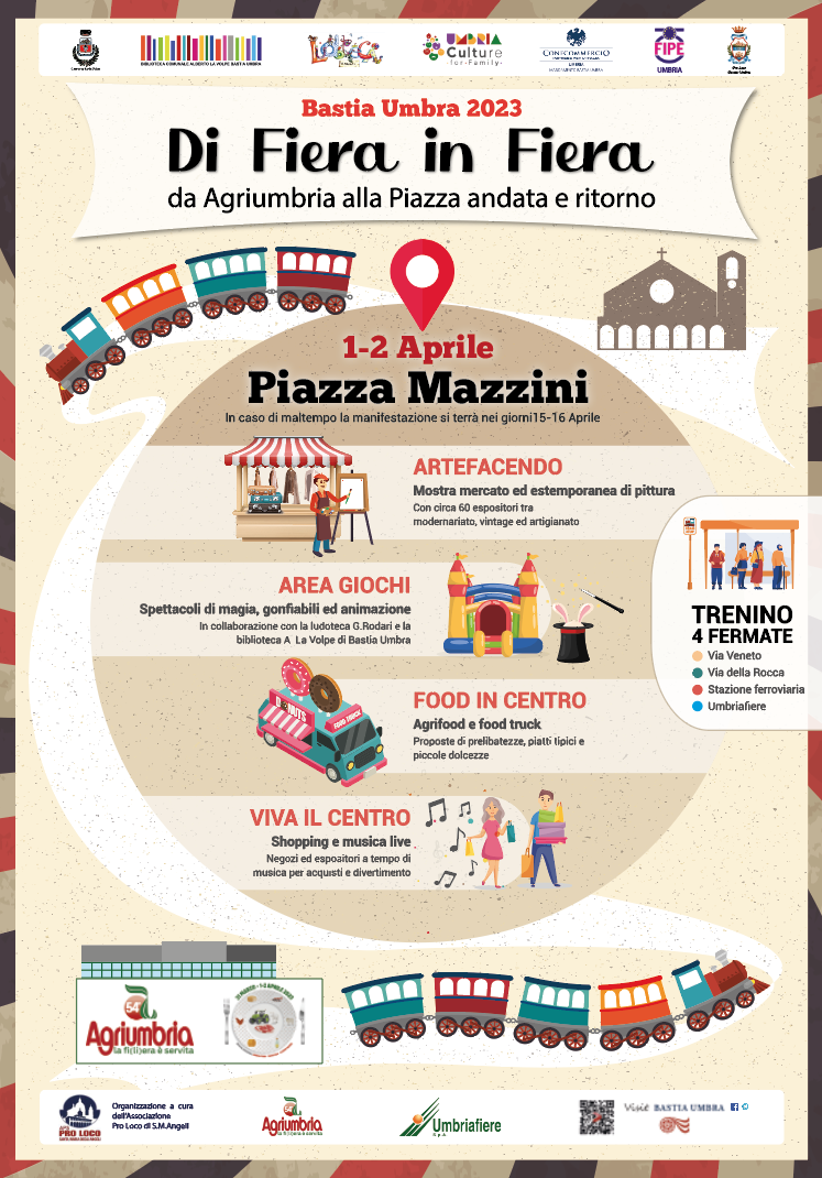 Durante l’annuale manifestazione Agriumbria, mostra Nazionale di Agricoltura, Zootecnia, Alimentazione, presso Umbriafiere, dal 31 marzo 2023 al 02 aprile 2023 l’Amministrazione comunale promuove un Fuorisalone in Piazza Mazzini, con la collaborazione di Confcommercio, Fipe, Pro Loco Bastia, organizzazione Pro Loco Santa Maria Degli Angeli . Trenino gratuito dalle 9.00 alle 19. 00 – da Umbriafiere al centro, con fermate in …
