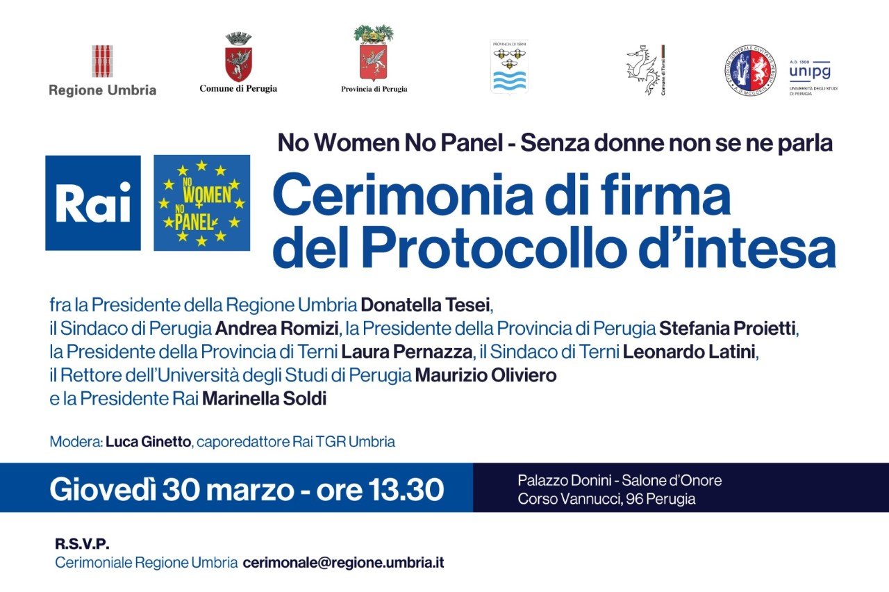“No Women No Panel – Senza donne non se ne parla”, firma del Protocollo d’intesa. Giovedì 30 marzo 2023, alle ore 13.30, Perugia, Salone d’Onore di Palazzo Donini.