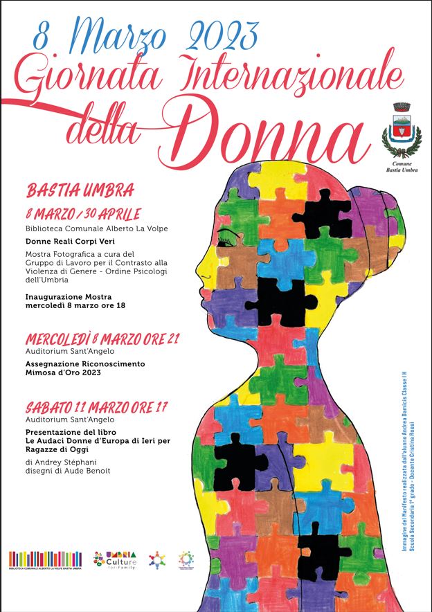 Con il Tavolo Tecnico per le Pari Opportunità e CUG, conferimento del “Premio Mimosa d’Oro”, mostre, incontri, presentazioni di libri, tanti gli appuntamenti dell’Amministrazione comunale. -Da mercoledì 8 marzo al 30 aprile presso la Biblioteca Comunale Alberto La Volpe, Mostra “Donne Reali – Corpi Veri” organizzata dal gruppo di Lavoro per il contrasto alla Violenza di Genere dell’Ordine degli Psicologi dell’Umbria …