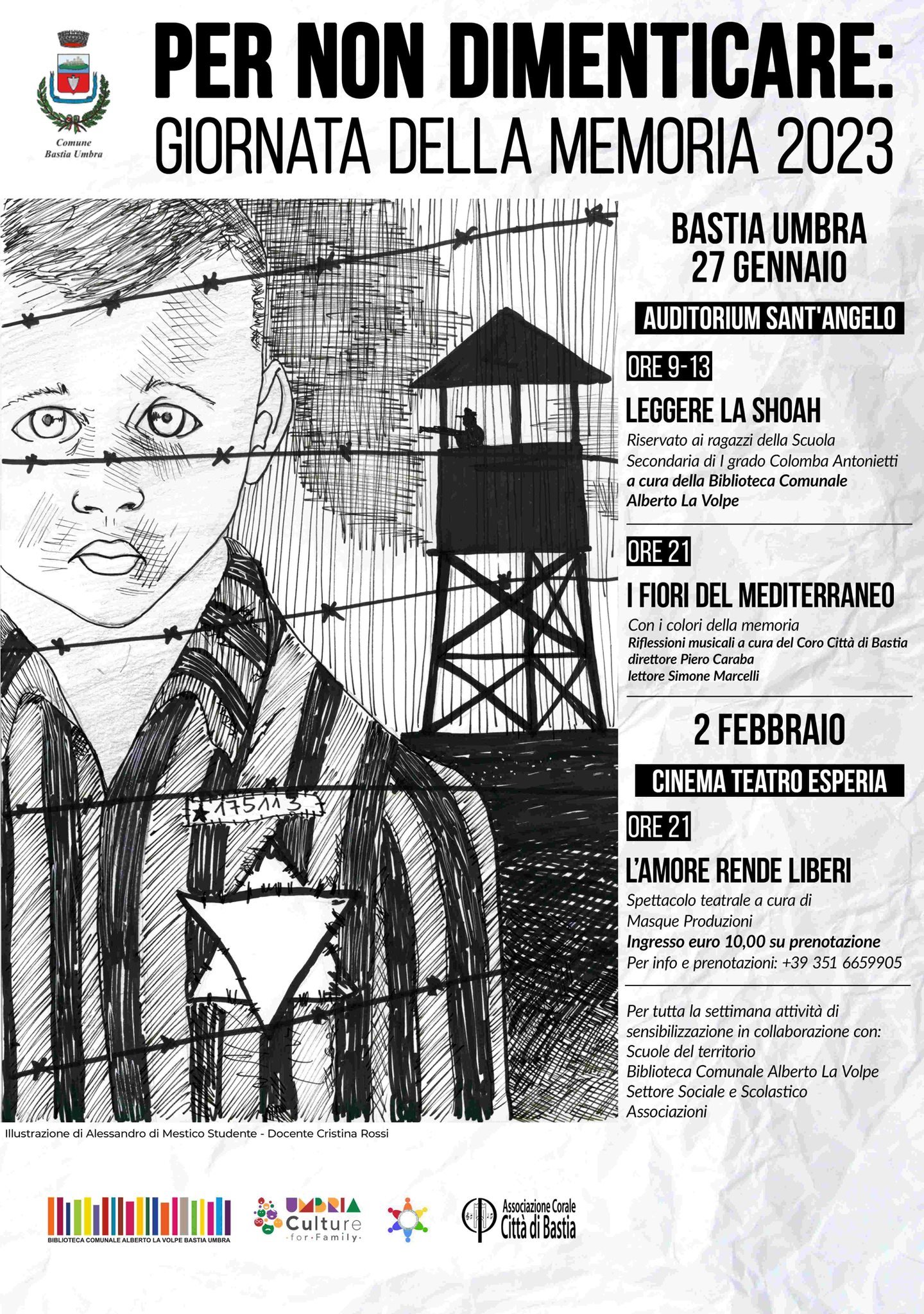 GIORNATA DELLA MEMORIA 27 GENNAIO 2023 Auditorium Sant’Angelo, Bastia Umbra: dalle ore 9 alle ore 13, Leggere la Shoah a cura della Biblioteca Comunale “Alberto La Volpe” Bastia Umbra rivolto alla scuola secondaria di primo grado Colomba Antonietti. Ore 21, I Fiori del Mediterraneo, riflessioni musicali a cura del Associazione corale Città di Bastia, Direttore Piero Caraba, letture di Simone Marcelli. 26/01/2023 COMUNE …