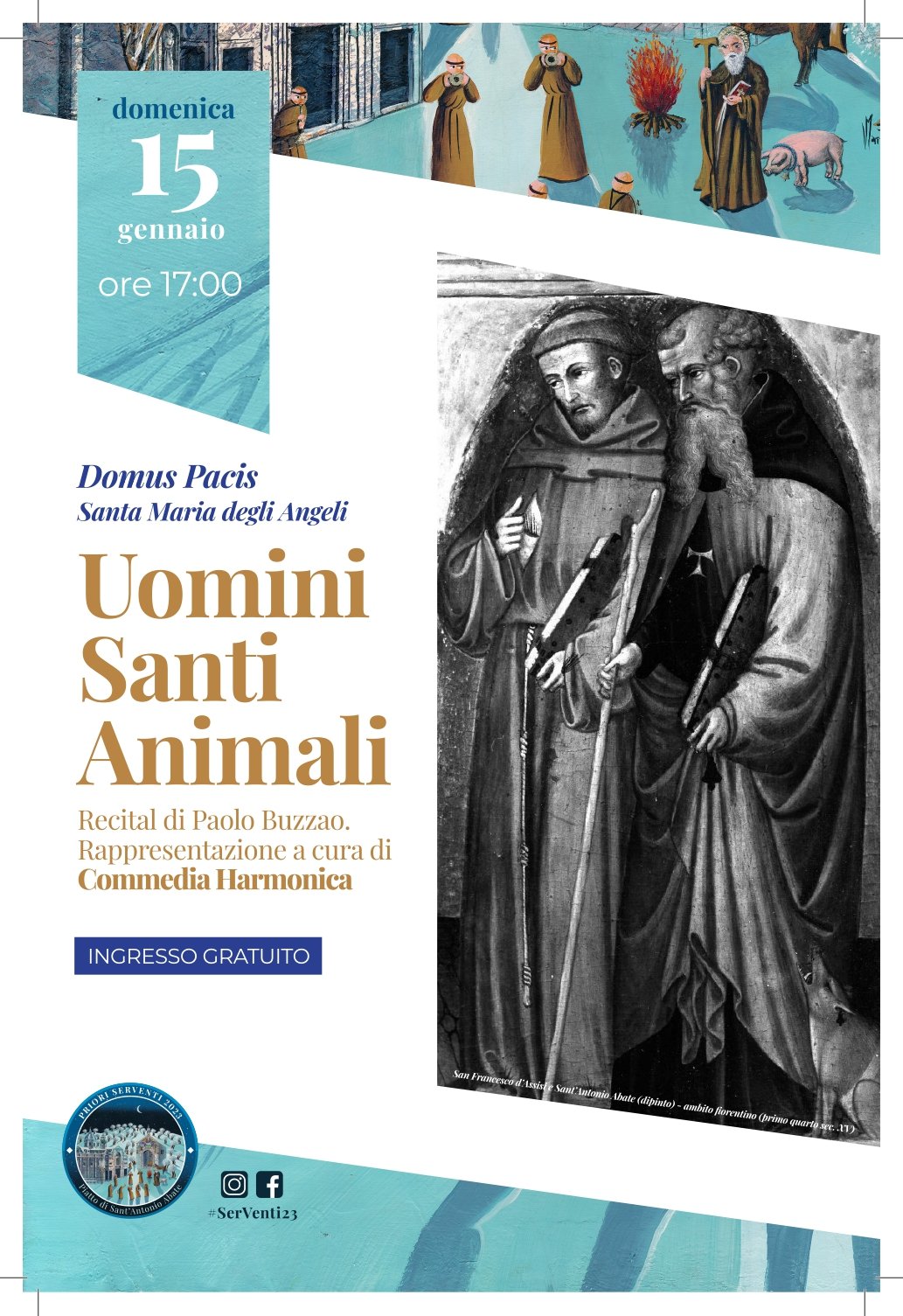 Domenica 15 gennaio 2023, alle 17.00, presso l’Hotel Domus Pacis di Santa Maria degli Angeli si terrà Il recital dal titolo “Uomini Santi Animali” messo in scena dalla Commedia Harmonica. Il gruppo musicale e attoriale, attraverso i dialoghi di due semplici lavoratori, mette in contrapposizione i due Santi, Antonio e Francesco. Si tratta di uno spettacolo umoristico, mai blasfemo, che …
