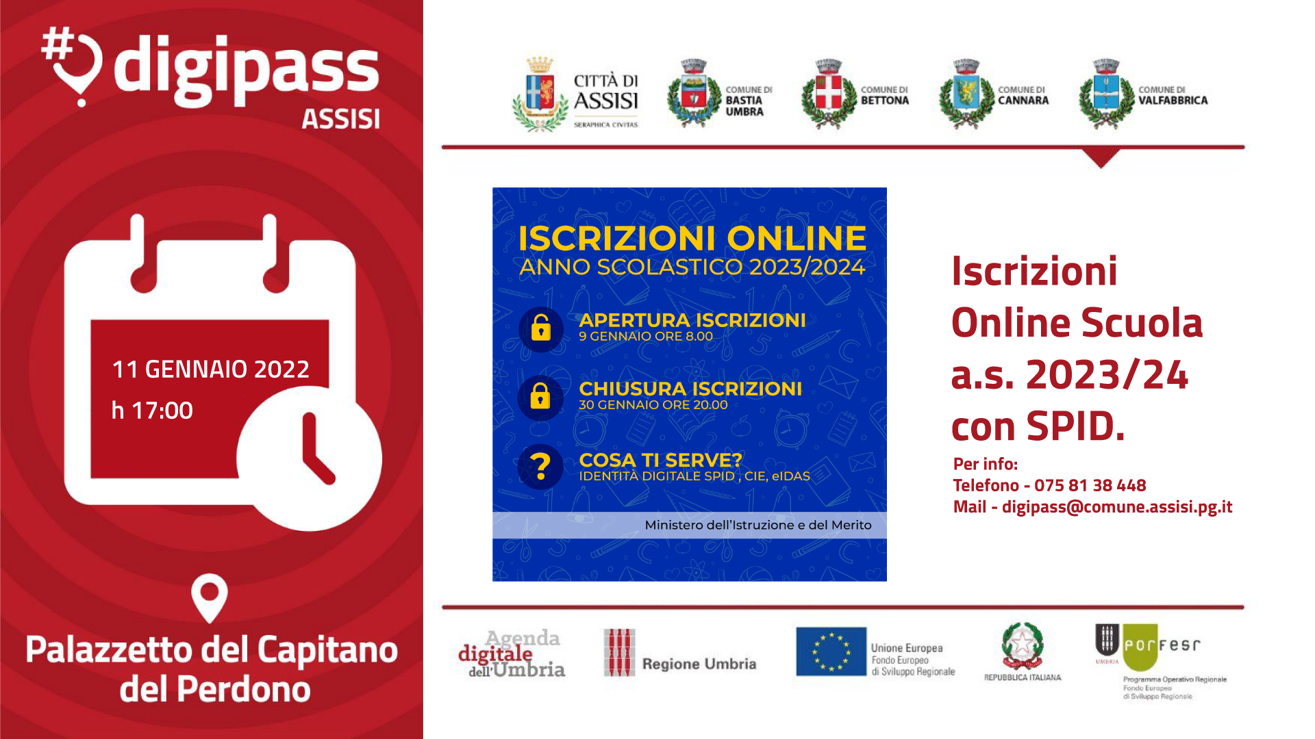 Mercoledì 11 Gennaio alle ore 17:00 al Digipass Assisi una giornata informativa sulle modalità di iscrizione dei figli a scuola attraverso il portale online del Ministero Tornano anche nel 2023 gli INFO DAY del Digipass di Assisi (Palazzo del Capitano del Perdono, Piazza Garibaldi, S. Maria degli Angeli) per avvicinare i cittadini agli strumenti digitali con incontri di formazione e …