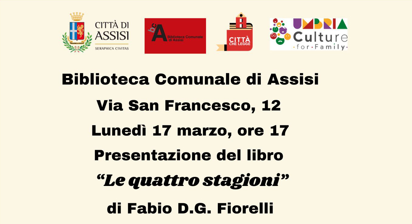 COMUNICATO STAMPA Presentazione del libro “Le quattro stagioni” evento per adulti Assisi, 10/03/2025 – La Biblioteca Comunale di Assisi invita tutte e tutti alla presentazione del libro “Le quattro stagioni” di Fabio D. G. Fiorelli, alla presenza dell’Autore. Il libro ripercorre in quattro tappe, che hanno l’andamento delle stagioni della vita, le esperienze formative che l’autore ha vissuto, attraverso …