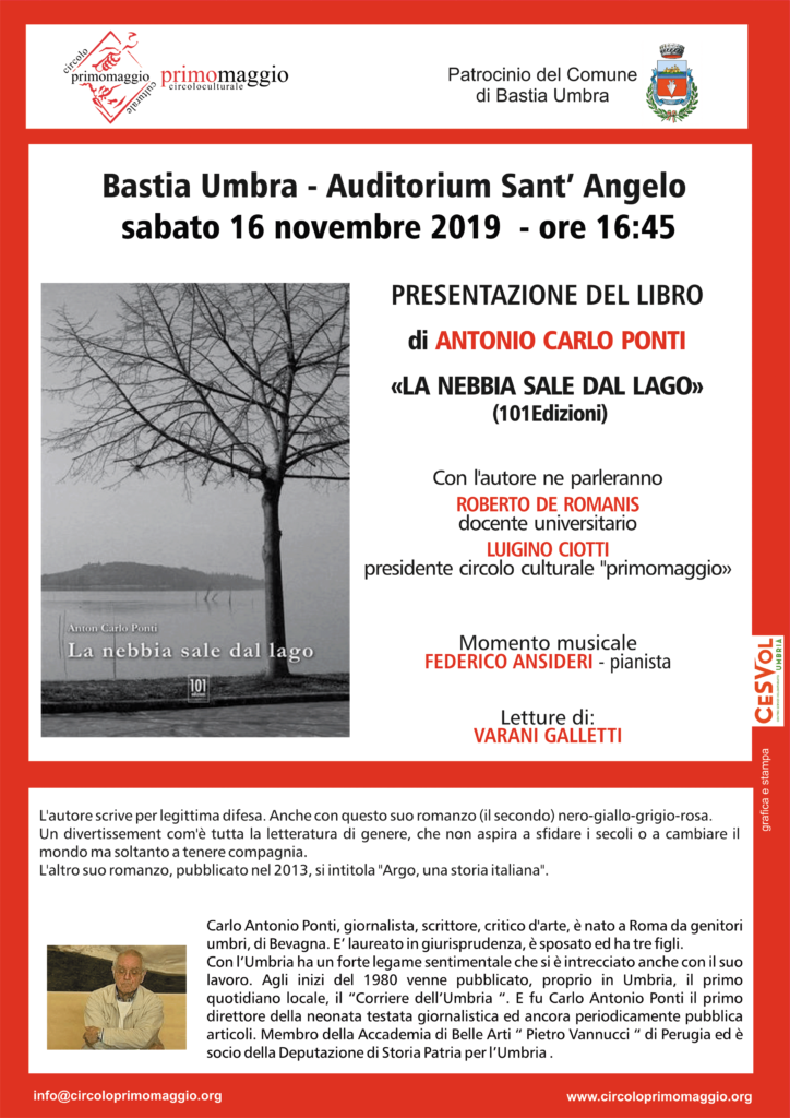 Bastia Umbra – Auditorium Sant’Angelo Sabato 16 novembre 2019 – ore 16,45 Presentazione del libro di ANTONIO CARLO PONTI La nebbia sale dal lago (101 edizioni) Con l’autore ne parleranno: ROBERTO DE ROMANIS – docente universitario LUIGINO CIOTTI – presidente circolo culturale “primomaggio” Momento musicale: FEDERICO ANSIDERI – pianista Letture di: VARANI GALLETTI ————————————————————————————————- L’autore scrive per legittima difesa. Anche …