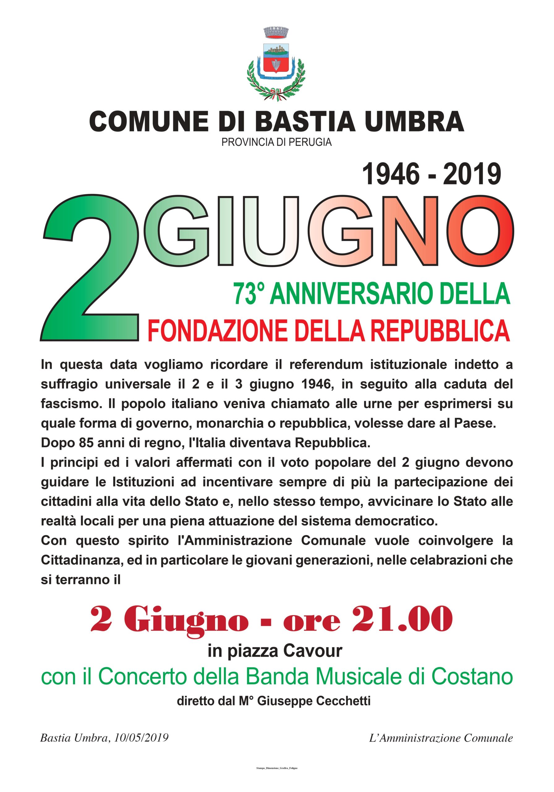 2 GIUGNO – ore 21.00 Piazza Cavour In occasione della 73^ Festa della Repubblica si terrà alle ore 21.00, in piazza Cavour, il tradizionale concerto della Banda Musicale di Costano , diretto dal M° Giuseppe Cecchetti. Nella stessa giornata sarà conferita alla D.ssa Rosella Aristei l’onorificenza di Cavaliere dell’Ordine “al Merito della Repubblica Italiana”. A tale proposito, di seguito si …