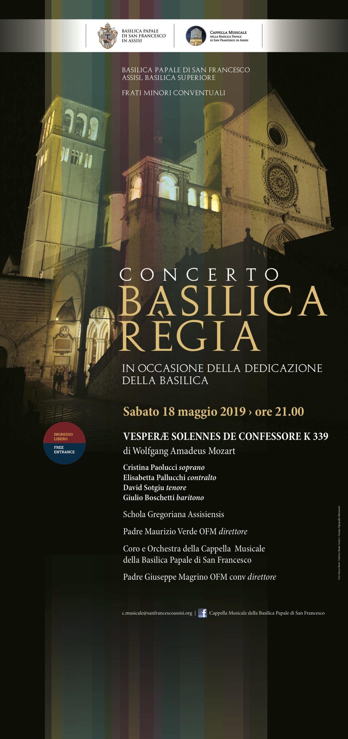 Torna il concerto Basilica Règia in occasione dell’anniversario della dedicazione della Basilica di Assisi. L’appuntamento, gratuito e aperto a tutti, è per domani sera (sabato 18 maggio) alle ore 21. Per l’occasione la Cappella Musicale della Basilica Papale di San Francesco proporrà i Vesprerae Solennes De Confessore K339 di Wolfgang Amadeus Mozart Cristina Paolucci, soprano Elisabetta Pallucchi, contralto David Sotgiu, …
