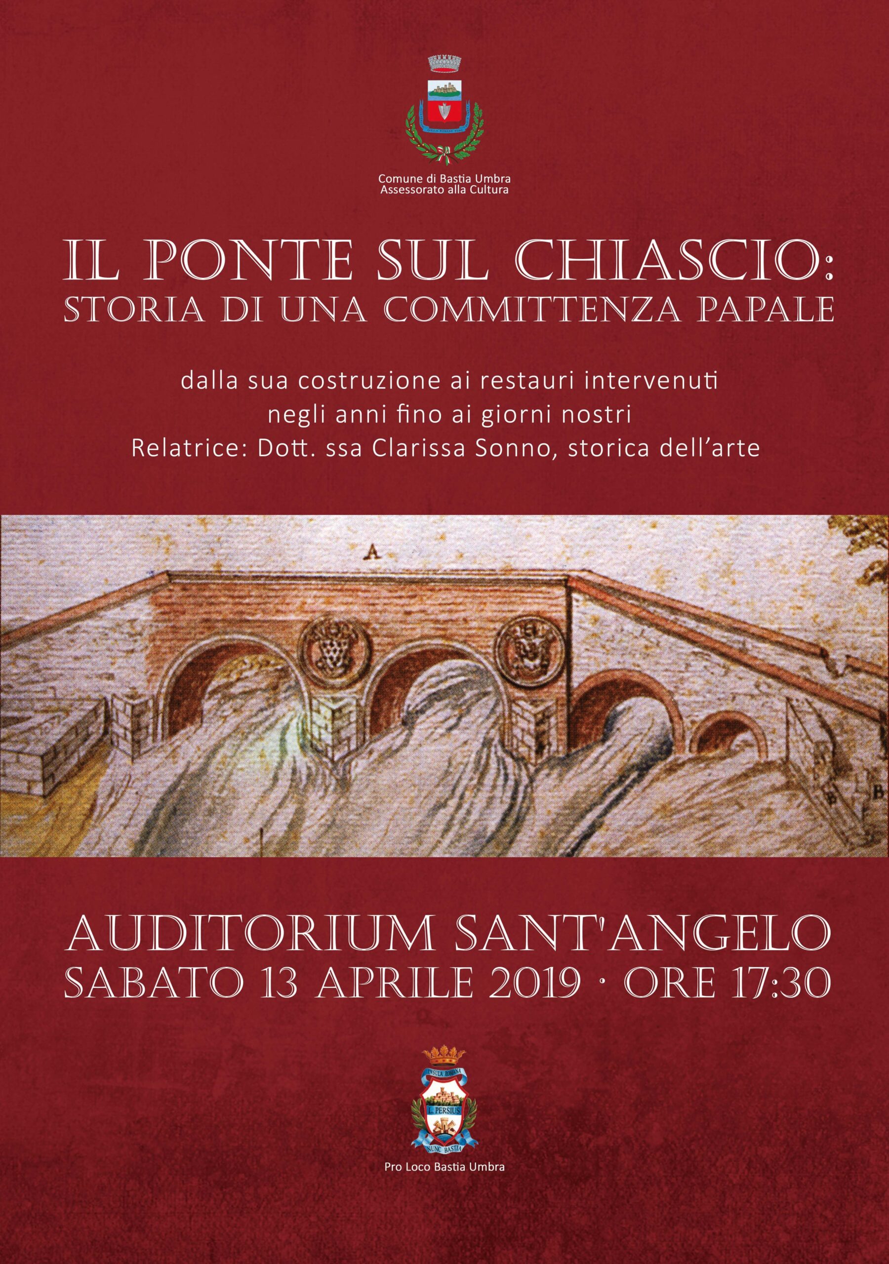Sabato 13 aprile 2019, alle ore 17:30, presso l’Auditorium Sant’Angelo, la Storica dell’Arte Clarissa Sonno parlerà sul tema “Il Ponte sul Chiascio”, la storia di un’ opera voluta da Papa Paolo III e dal suo successore Papa Gregorio XVIII, risalente al XVI secolo e che ancora oggi unisce la città e ne costituisce uno degli elementi più rappresentativi. La conferenza …