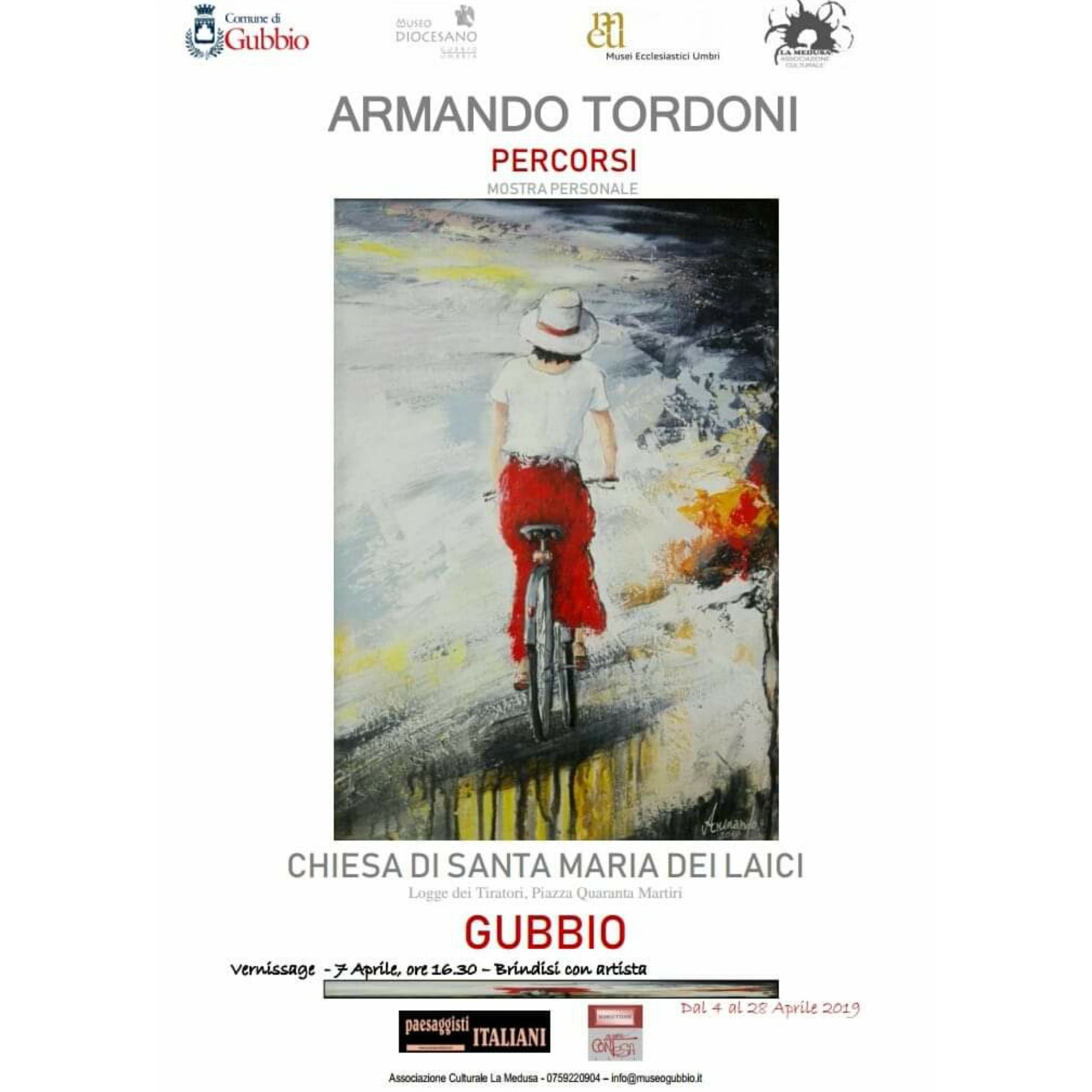 Dal 4 al 28 aprile, la Chiesa di Santa Maria dei Laici, gioiello architettonico del centro storico di Gubbio, ospita la mostra Percorsi di Armando Tordoni. Già ospite a Gubbio negli scorsi anni, in varie manifestazioni artistiche collettive, nel 2019 Tordoni torna in città ma con un progetto personale, curato sempre dall’Associazione Culturale la Medusa, con il patrocinio del Comune …