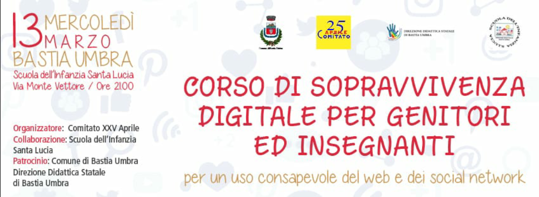 Mercoledì 13 Marzo – ore 21.00 Scuola dell’Infanzia S. Lucia (Via Monte Vettore) Organizzato dal Comitato XXV Aprile, in collaborazione con Scuola dell’Infanzia S. Lucia, con il Patrocinio del Comune di Bastia Umbra e della Direzione Didattica Statale, si terrà il “Corso di sopravvivenza digitale per genitori ed insegnanti – Per un uso consapevole del web e dei …