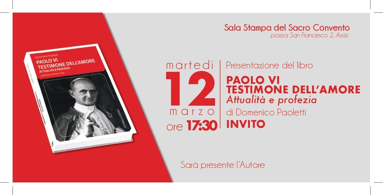 ASSISI (PERUGIA), 11 MAR – Verrà presentato, domani 12 marzo alle 17.30, nella Sala Stampa della Basilica di San Francesco d’Assisi il libro “Paolo VI, testimone dell’Amore” scritto dal Vicario del Sacro Convento di Assisi, padre Domenico Paoletti. Saranno presenti all’incontro, oltre l’autore, l’onorevole Fausto Bertinotti, il teologo Piero Coda, e il sociologo Luca Diotallevi. L’evento moderato dal direttore della Sala Stampa, padre Enzo Fortunato, verrà …