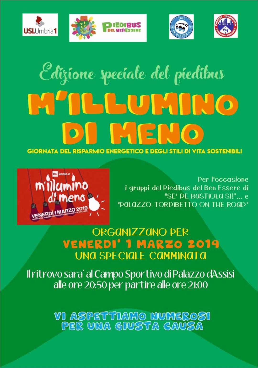 M’illumino di Meno 2019 giornata del risparmio Energetico e degli stili di vita sostenibili, PER L’OCCASIONE I GRUPPI DEL PIEDIBUS DEL BEN ESSERE DI ” SE’ DE LA BASTIOLA SI !….” E ” PALAZZO – TORDIBETTO ON THE ROAD” organizzano un’edizione speciale del Piedibus. Venerdì 1 MARZO 2019 si svolgerà una “Speciale Camminata”, il ritrovo è previsto alle ora 20.50 …