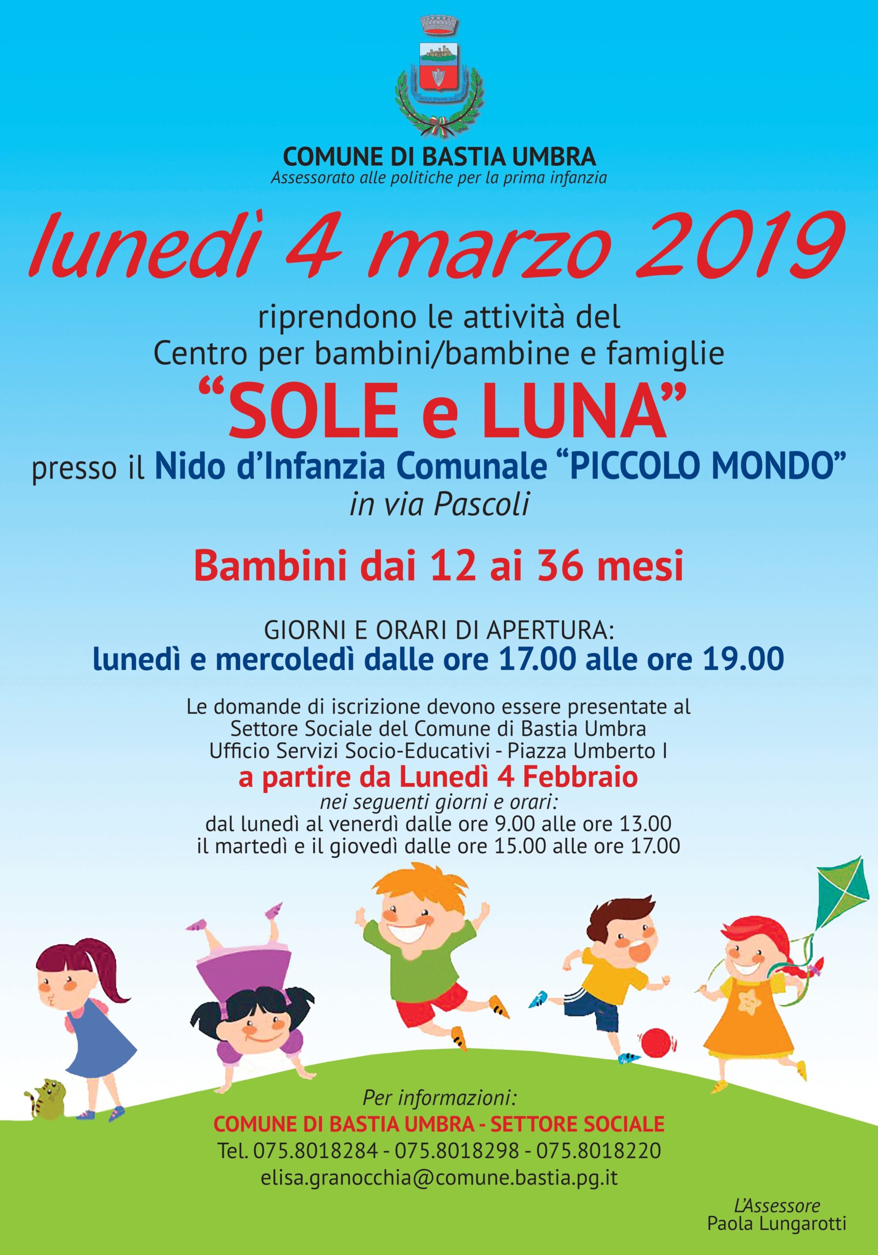 Dal 4 Marzo 2019 riprenderanno le attività del Centro “Sole e Luna”, per bambine/i e famiglie, presso il Nido Comunale Piccolo Mondo. Il servizio, aperto tutti i lunedì e i mercoledì dalle 17:00 alle 19:00, accoglie bambini dai 12 ai 36 mesi e una loro figura di riferimento familiare, che potrà cimentarsi con le educatrici del nido in attività laboratoriali …