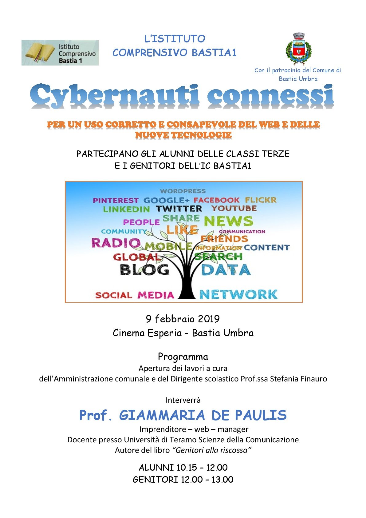 “Cybernauti connessi – per un uso corretto e consapevole del web e delle nuove tecnologie”, è questo il titolo di un Convegno che si svolgerà il 9 febbraio 2019 al Cinema Esperia di Bastia Umbra, organizzato dall’Ist. Comprensivo Bastia 1 e patrocinato dal Comune di Bastia Umbra. Parteciperanno gli alunni delle classi terze e i genitori dell’Ist. Comprensivo Bastia 1. …